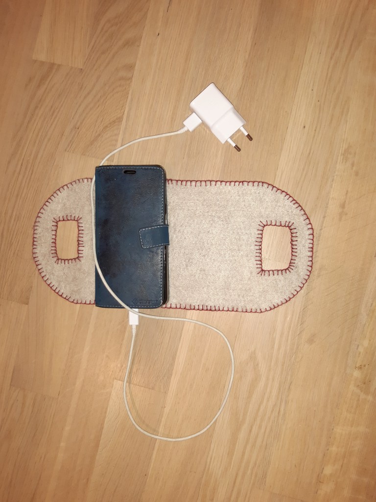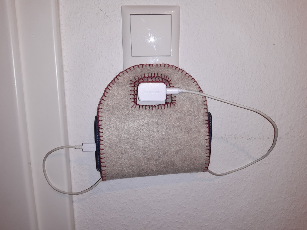 Zugegeben, ich bin ein bisschen neidisch (aber auch sehr stolz) darauf, wie sich meine Tochter einfach so überlegt, wie man ein Handy an die Dose bringen könnte. Ich selber habe schon mehrmals Ladestationen genäht. Die Schnitte waren aber sehr viel aufwändiger.