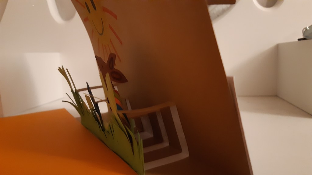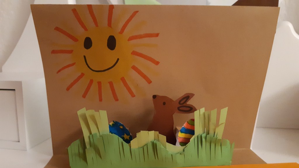Die Karte habe ich mit der gleichen Pop-Up-Technikgebastelt wie die Pop-Up-Karte für Opa. Dieses mal verwendete ich Ostermotive.