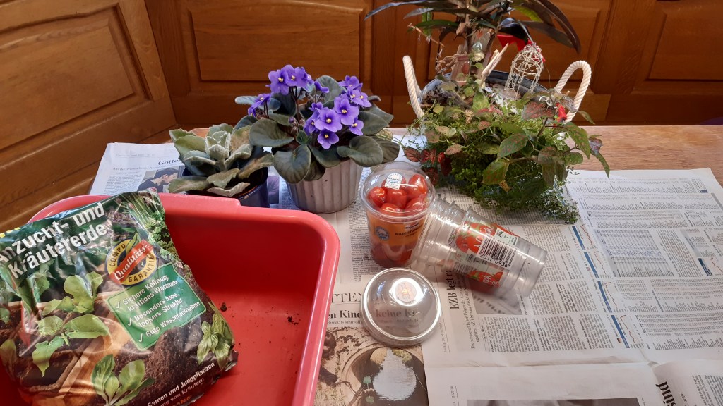 Und dazu verwenden wir Naschtomatenbecher. Es erleichtert mein Gewissen, wenn ich diese stabilen Plastikteile mit Deckel wenigstens noch für etwas anderes verwende, als dafür, ein halbes Pfund Tomätchen nach Hause zu transportieren. Oftmals ist es aber schwer, Tomaten ohne Verpackung zu finden. Deshalb muss ich da als Mama ab und an mal durch. Ich sammle die Becher natürlich, und recycle, wo immer möglich… und für die Stecklingsvermehrung eignen sie sich bestens. Durch den Deckel herrscht hohe Luftfeuchte rund um die abgeschnittenen Pflanzentriebe oder Blattteile, so dass sie auch ohne Wurzeln eine Weile gut überleben können, bis sie dann selber Wurzeln treiben, und zu vollständigen Pflanzen werden.