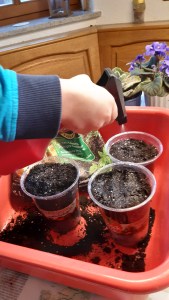 6. Deckel drauf und an eine warme Stelle im Haus stellen. Junge Pflanzenteile ohne Wurzeln vertragen keine direkte Sonne! Gießen ist nicht nötig, da durch den Deckel die Luftfeuchte im Becher recht hoch bleibt. Der Bubikopf kann evtl. manchmal mit Wasser besprüht werden. Usambaraveilchen und Elefantenohr sind sehr trockentolerant. Die benötigen auf keinen Fall mehr Feuchtigkeit!