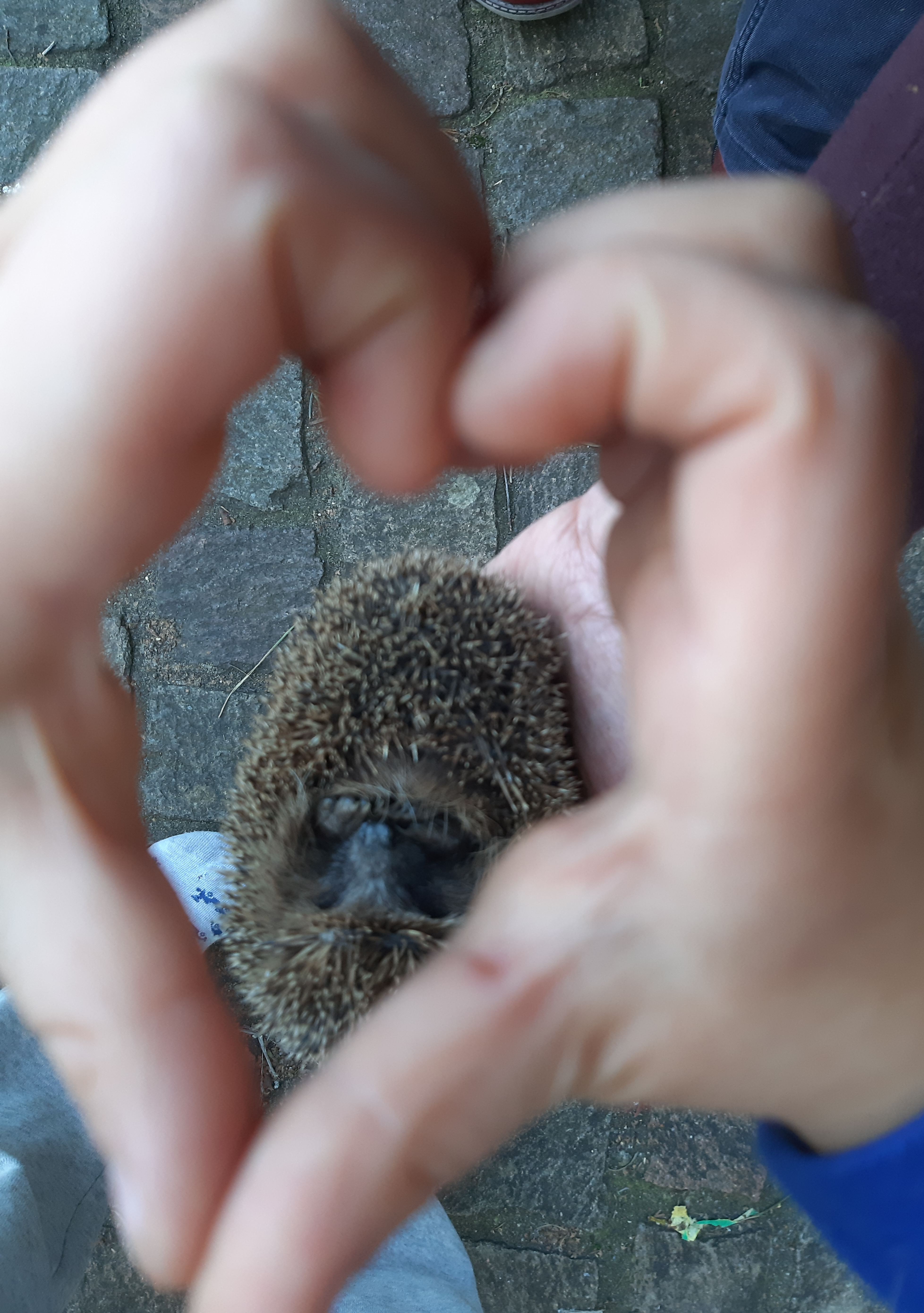 Mama entschied sich, dass wir den Igel erstmal mit nach Hause nehmen und mit Katzenfutter verwöhnen durften. Ob er es alleine schaffen würde, schien ihr zu ungewiss.