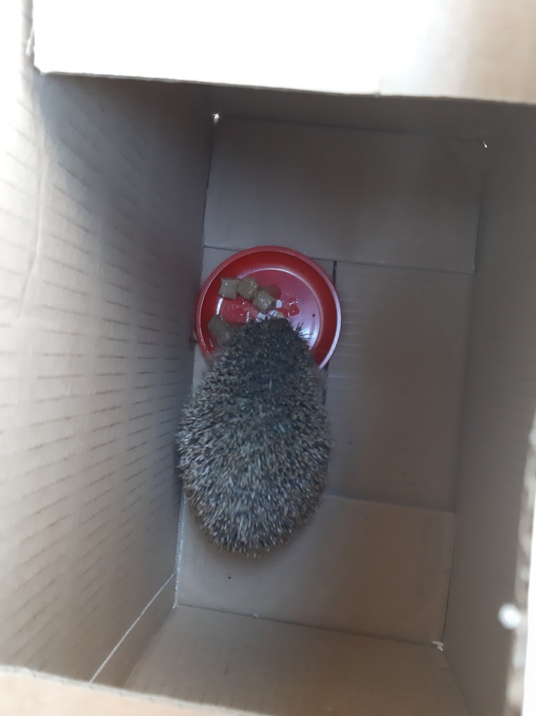 Der Igel stürzte sich auf das Futter, was sehr ungewöhnlich war, da wir gerade erst den Karton zugemacht hatten. Eigentlich rechneten wir damit, dass er erst einmal warten würde, bis wir weggegangen wären. Aber der Hunger schien seeehr groß zu sein.