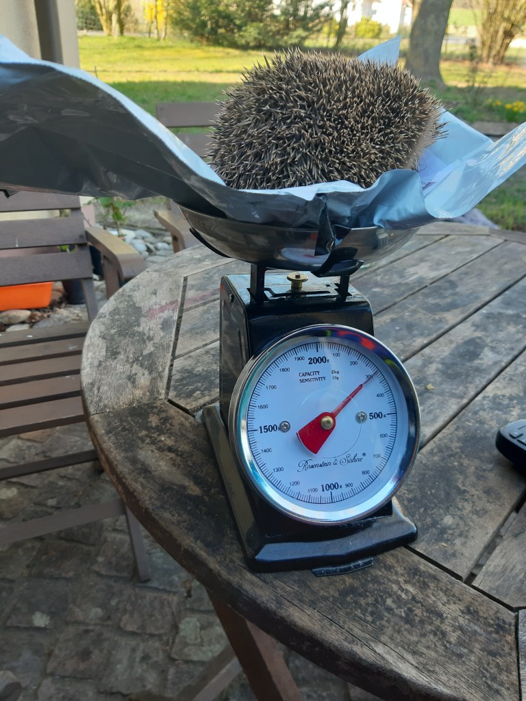 Danach wogen wir den kleinen Igel, weil wir gehöhrt hatten, dass gesunde Igel die gerade Winterschlaf hatten um die 500g wiegen sollten, um zu überleben.