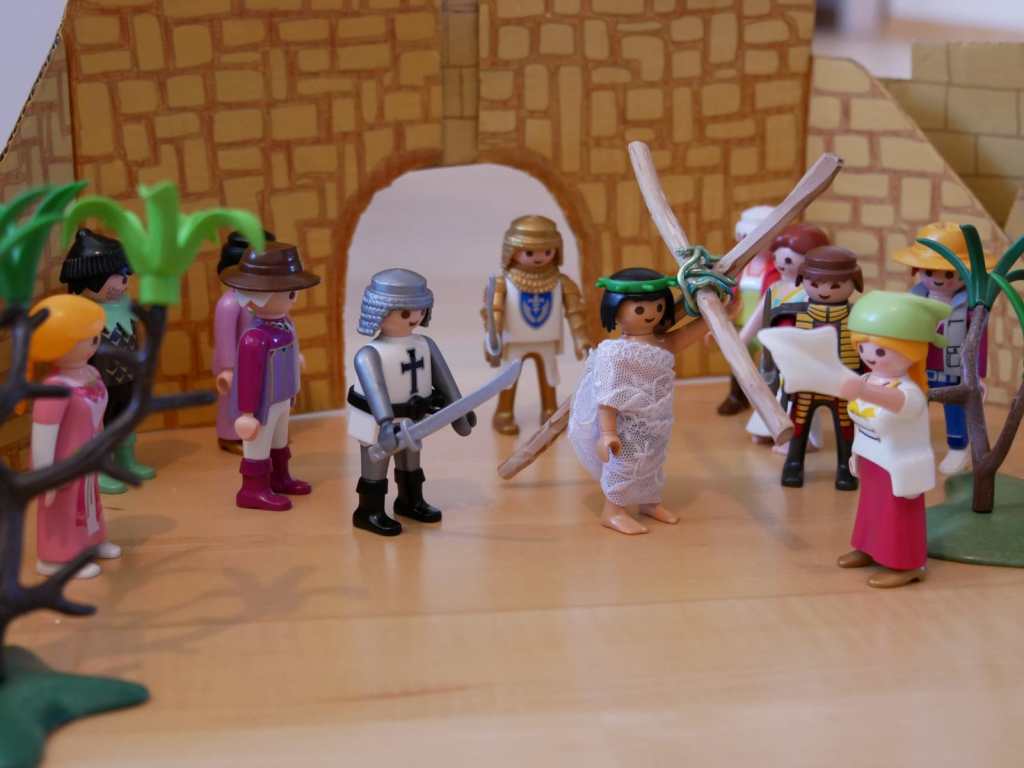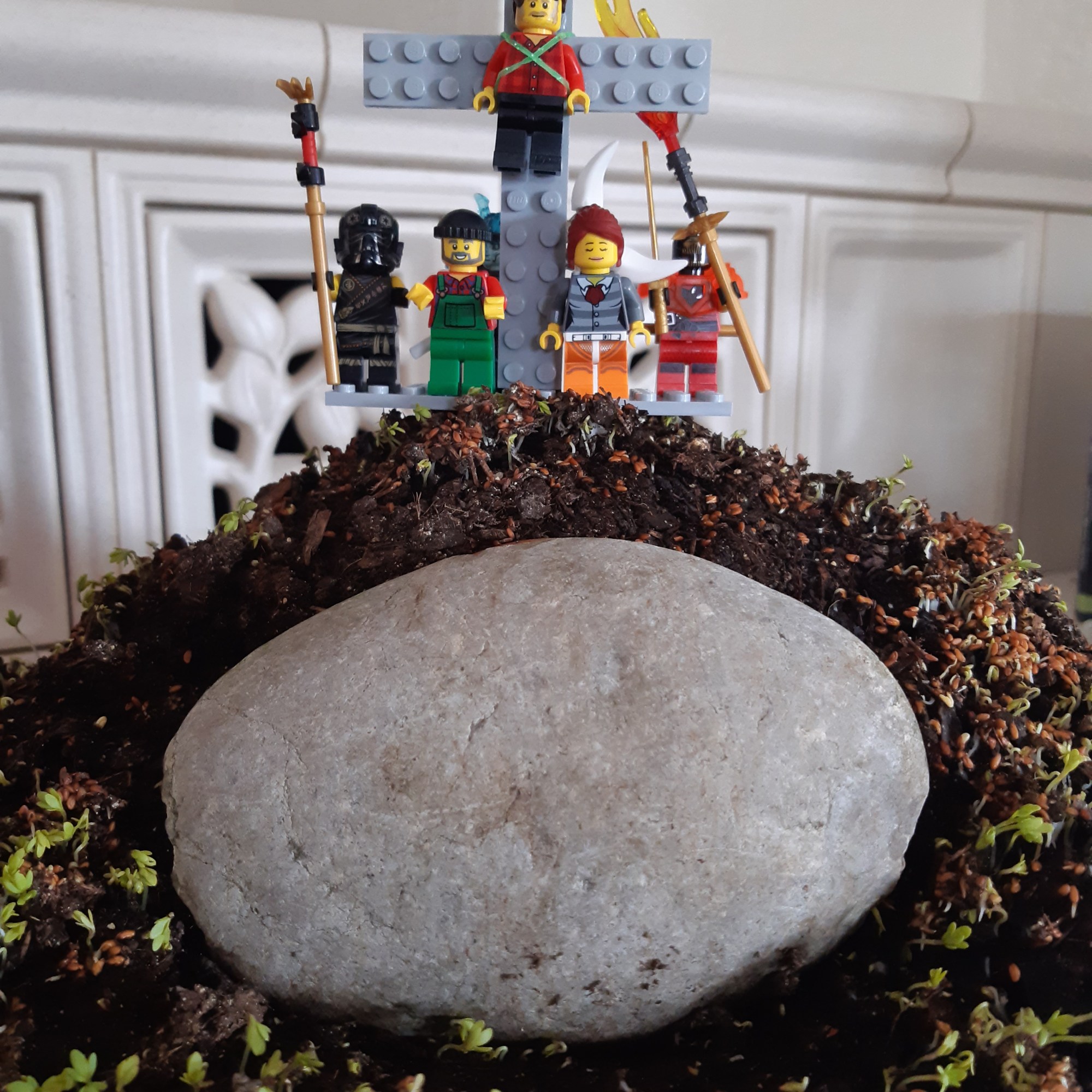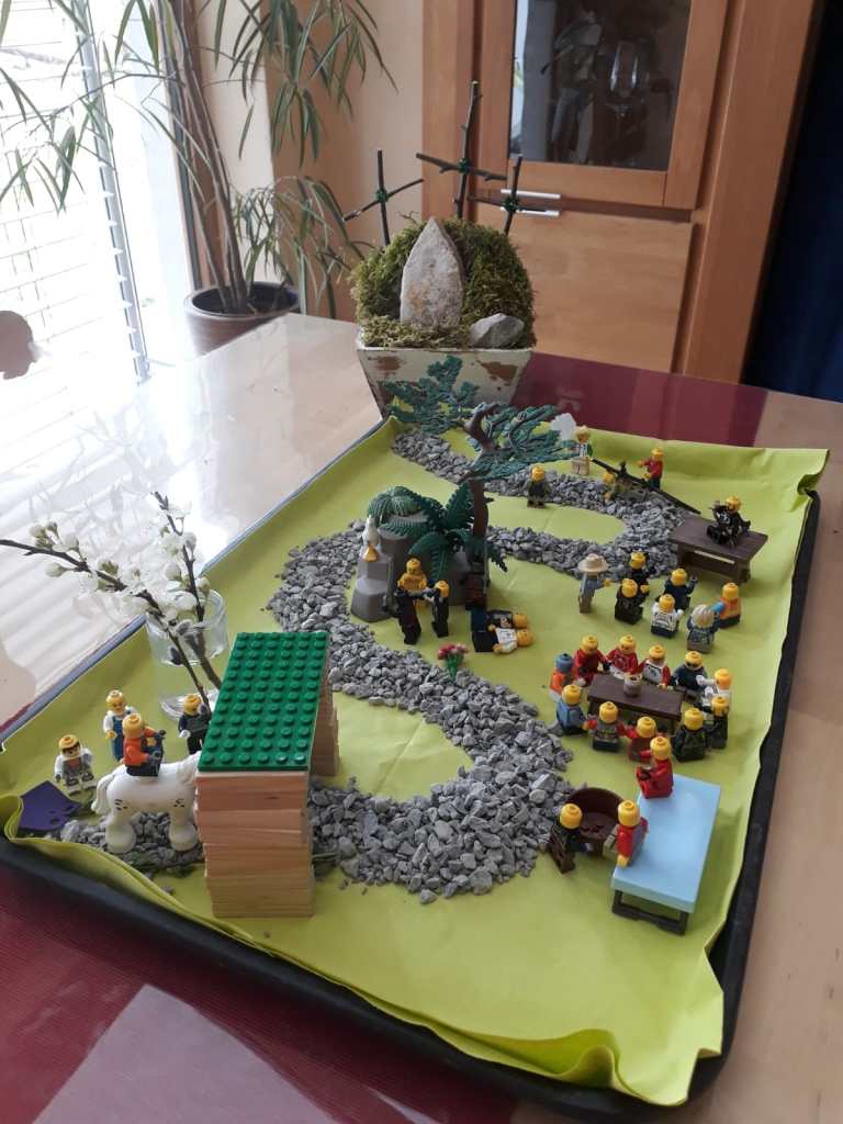 Dieser tolle LEGO-Kreuzweg schaut sehr groß aus. Aber schaut mal genauer: das ist alles nur auf einem Kuchenblech! Was könnt Ihr alles entdecken?