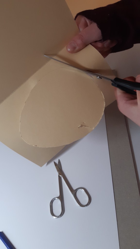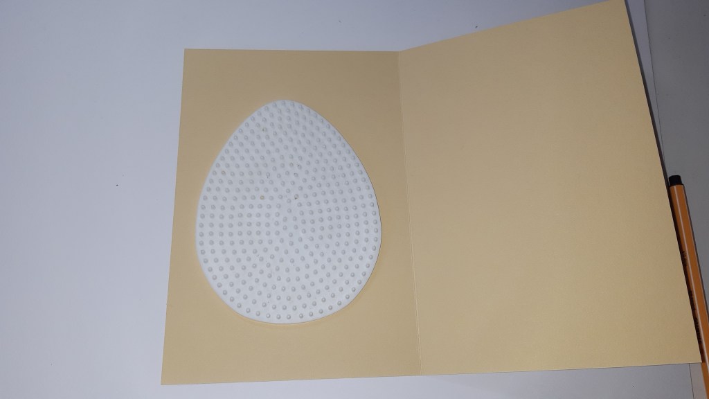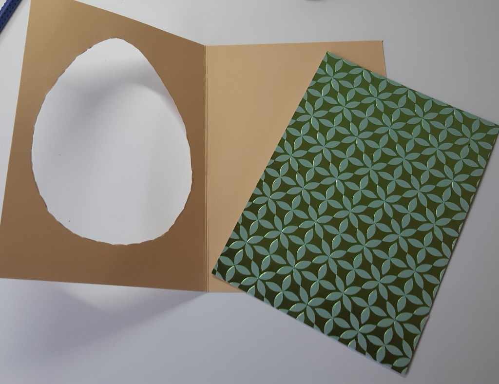Lege nun die Ostereiform auf die Vorderseite des gefalteten Fotokartons und fahre mit Bleistift um sie herum.