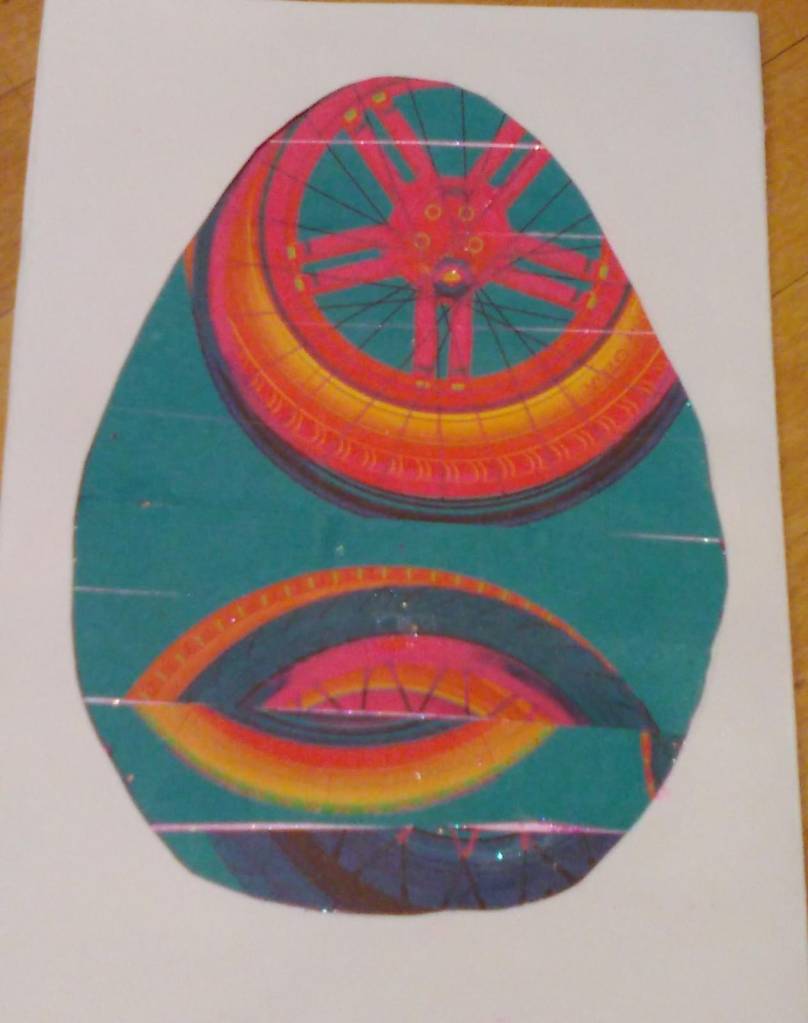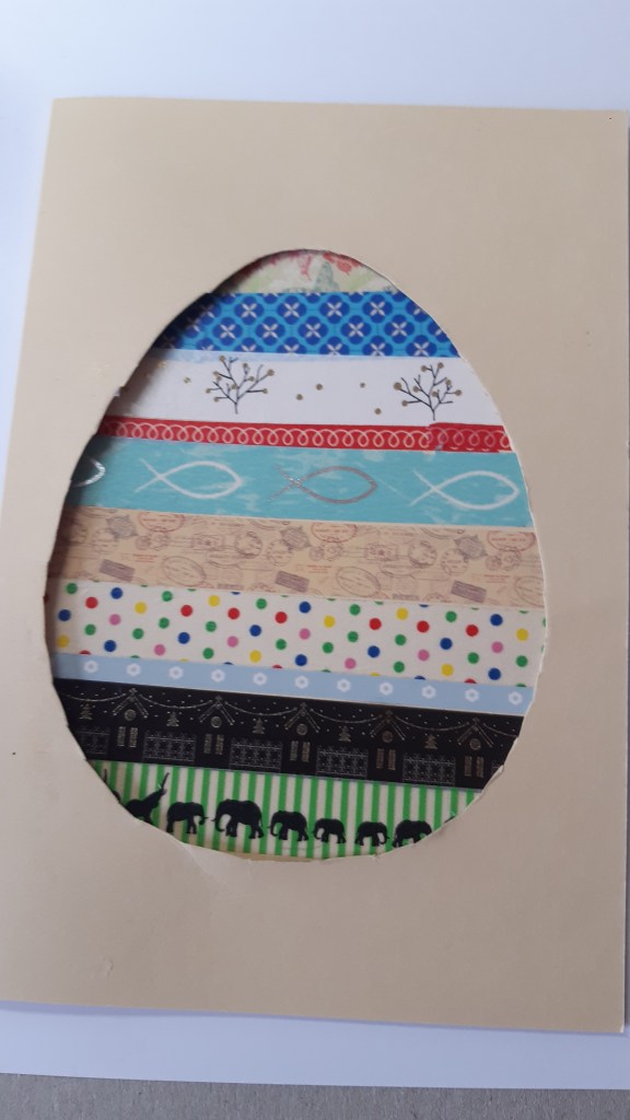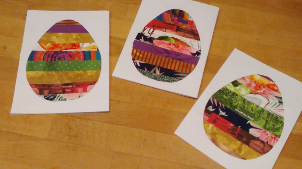 Wir haben aus Mangel an Washi Tapes Streifen aus bunten Magazinen verwendet, mit äußerst überzeugendem Ergebnis. Wir bleiben daheim. Dafür haben wir zehn selbstgemacht Osterkarten auf die Reise geschickt.