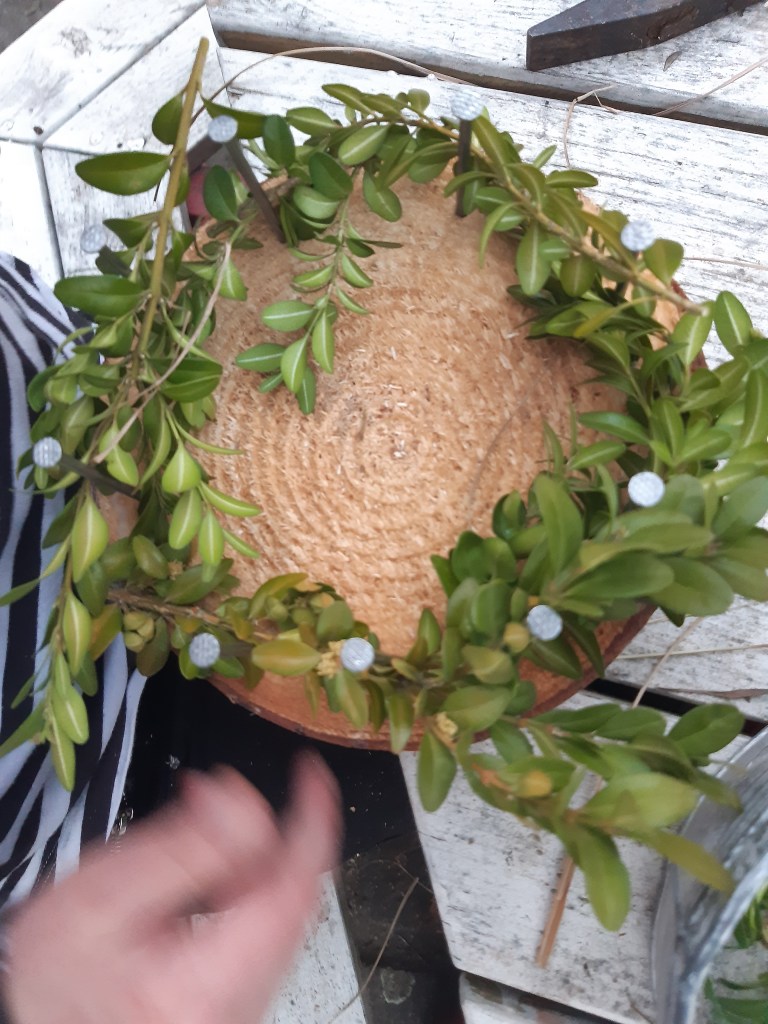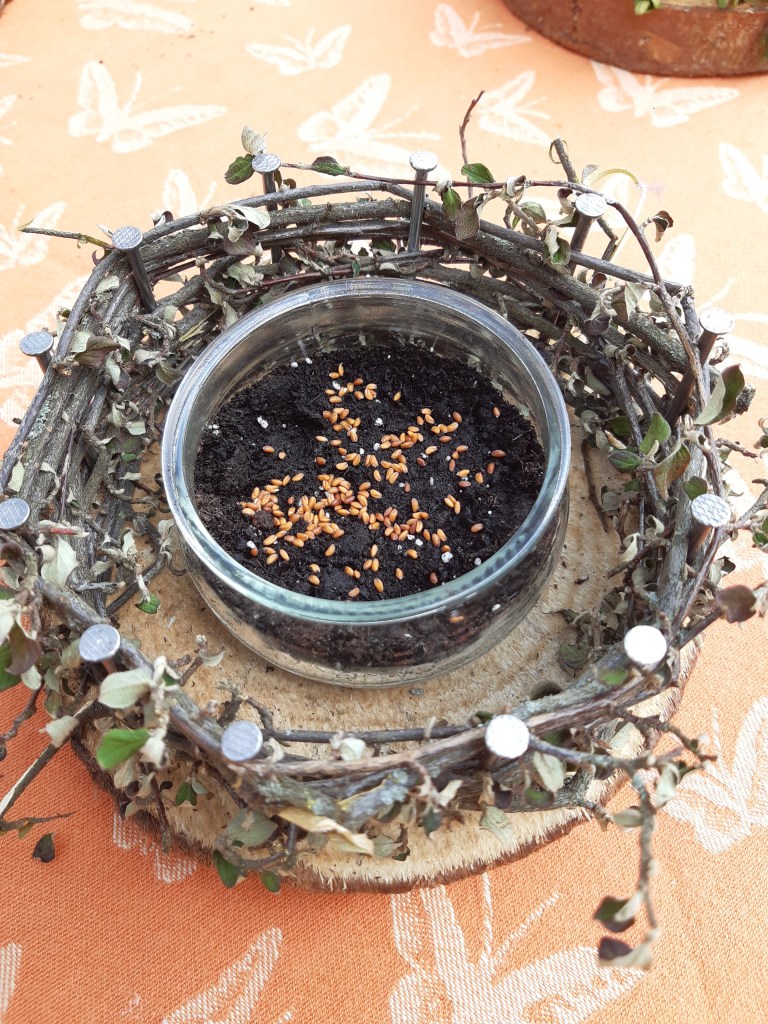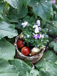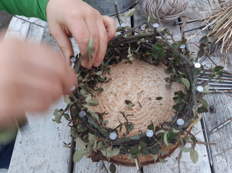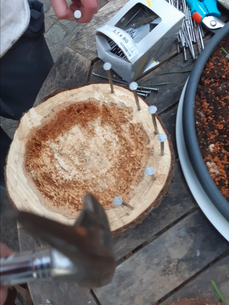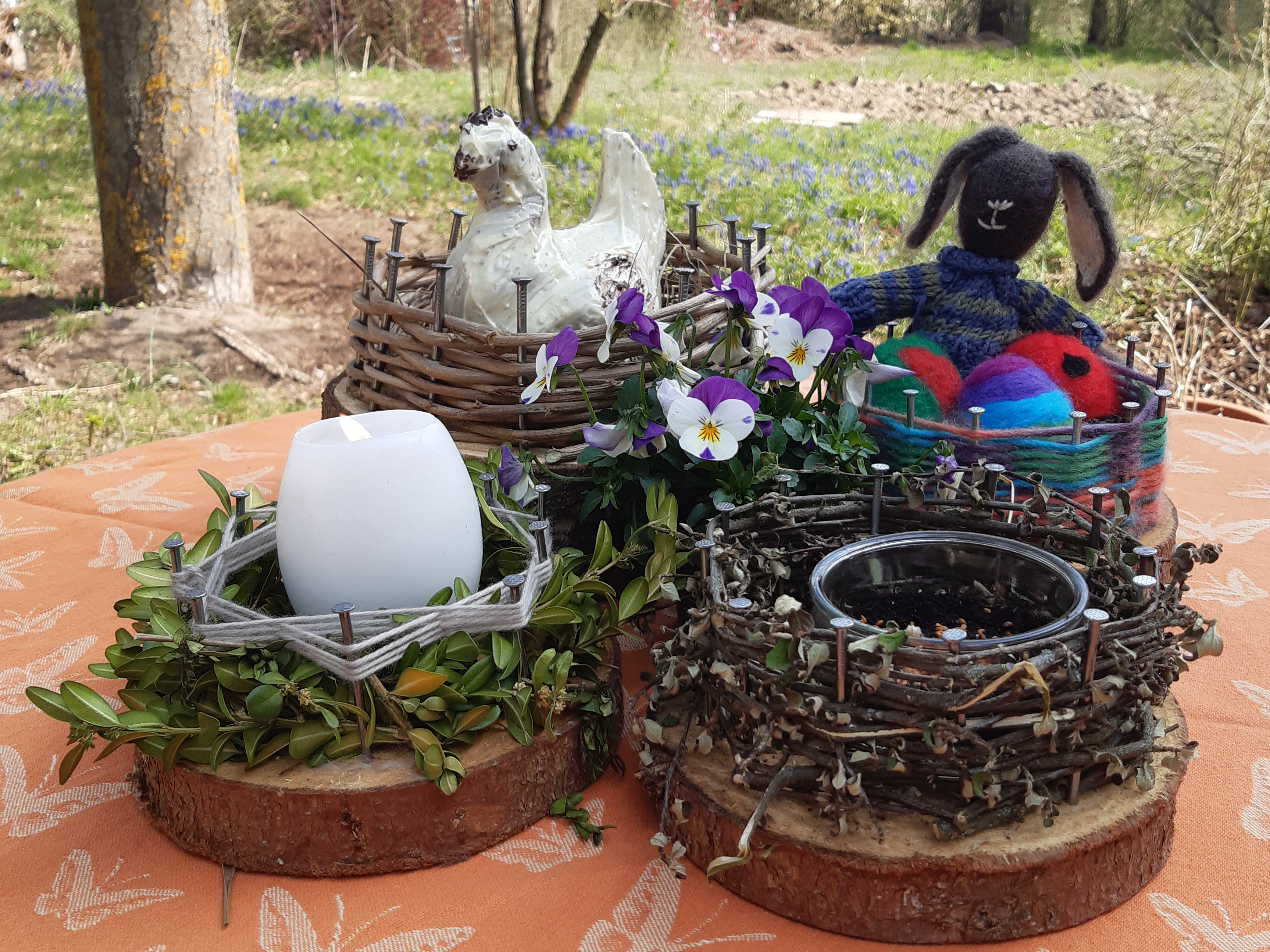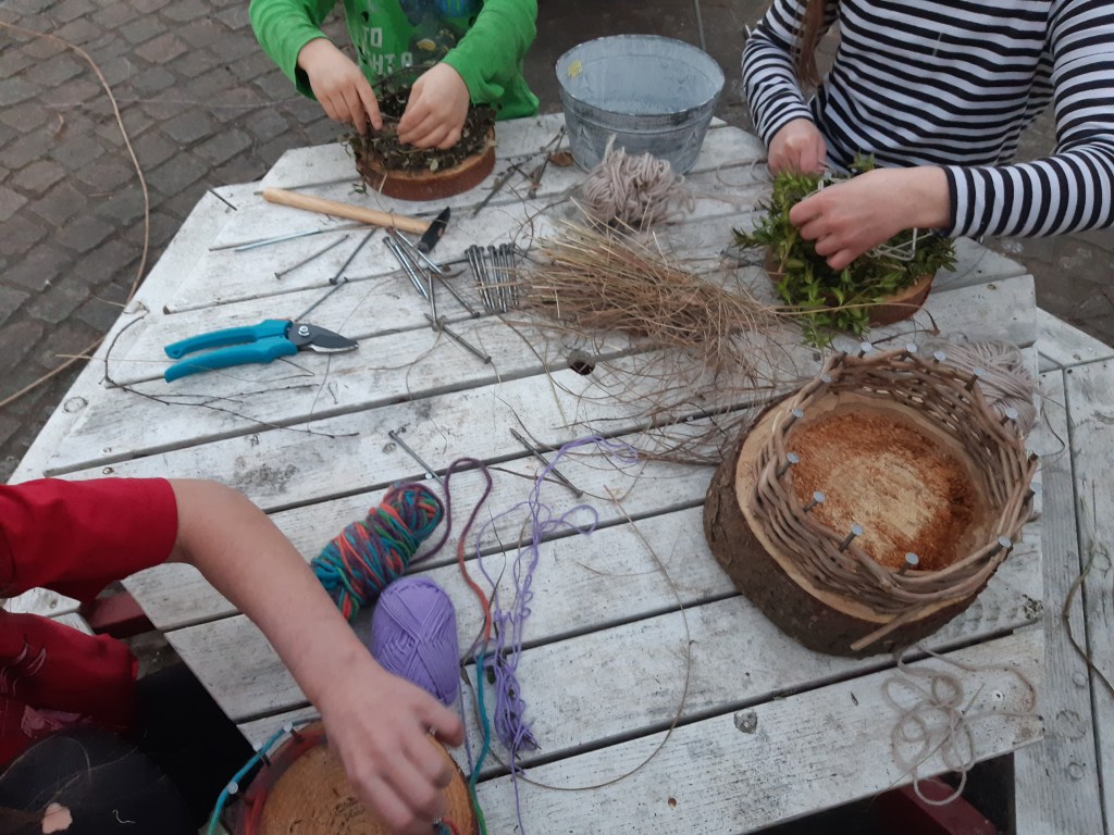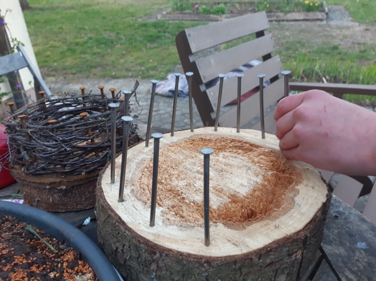 Heute wird es laut im Garten. Wenn vier Kinder gleichzeitig hämmern, hat die ganze Straße was davon. Wir bauen Osternester für Kerze, Gebäck, Eier oder junges Grün.