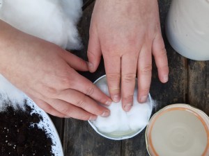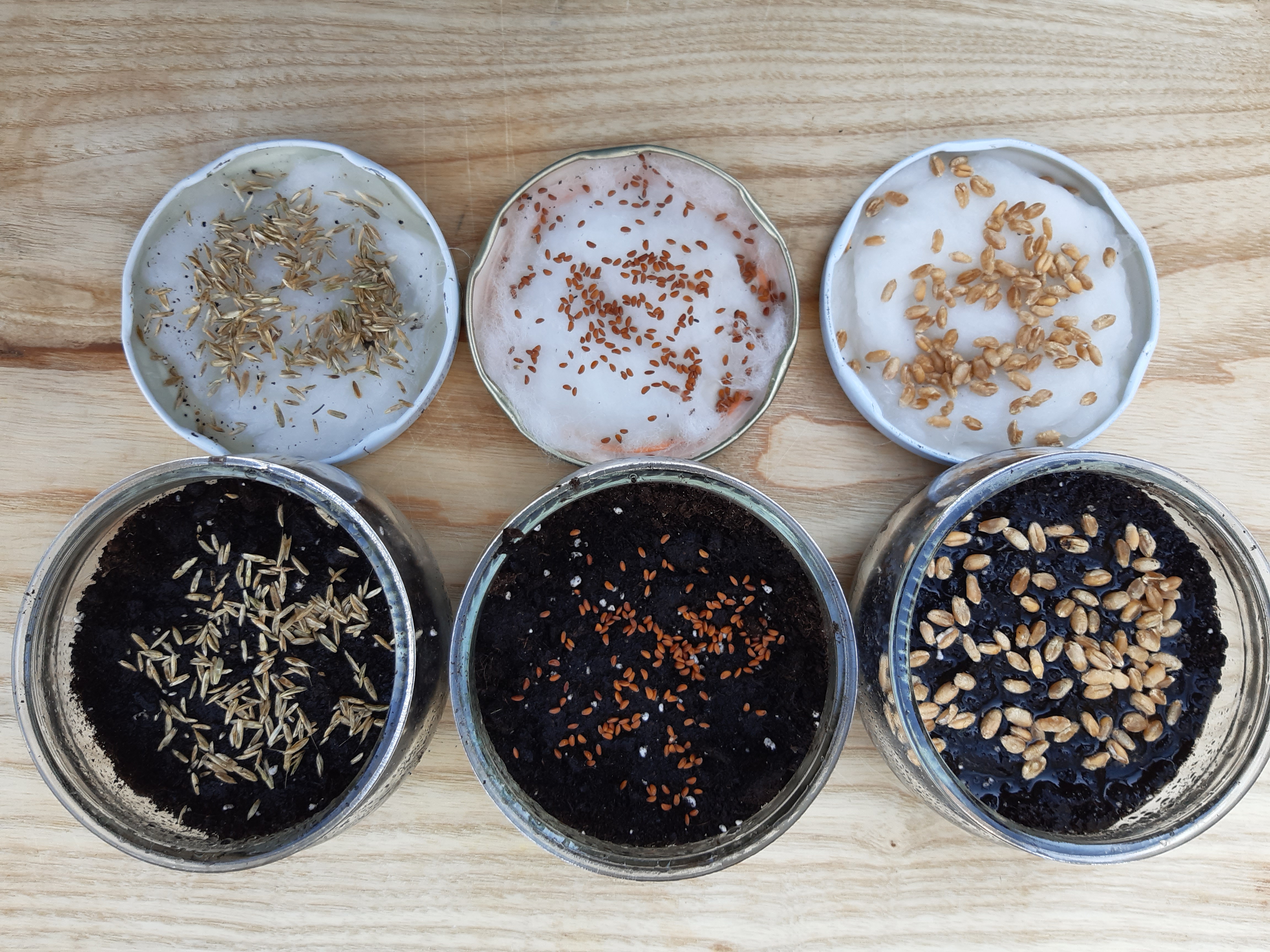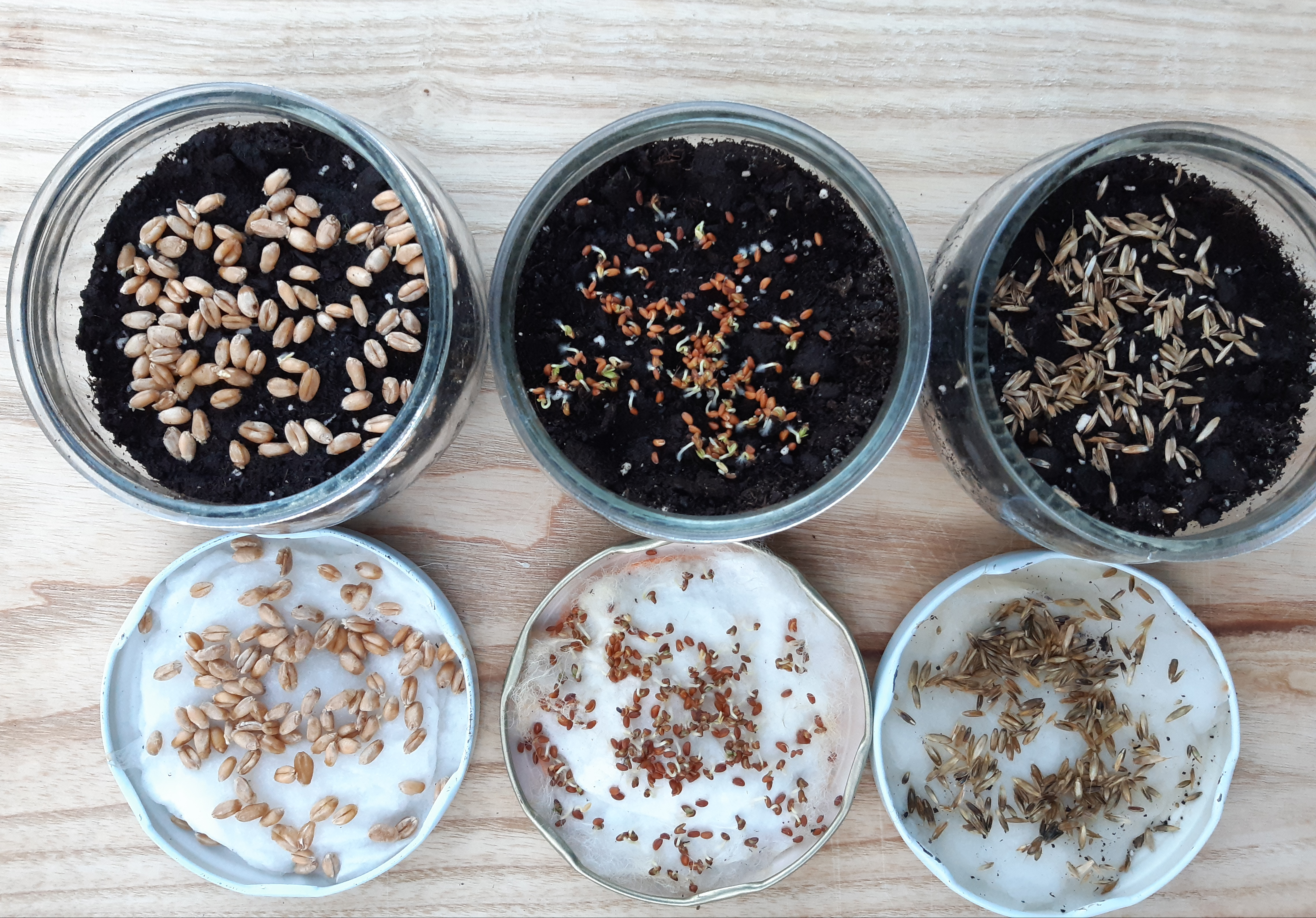 - Saatgut von Weizen (links), Kresse (mitte) und Oster- bzw. Katzengras