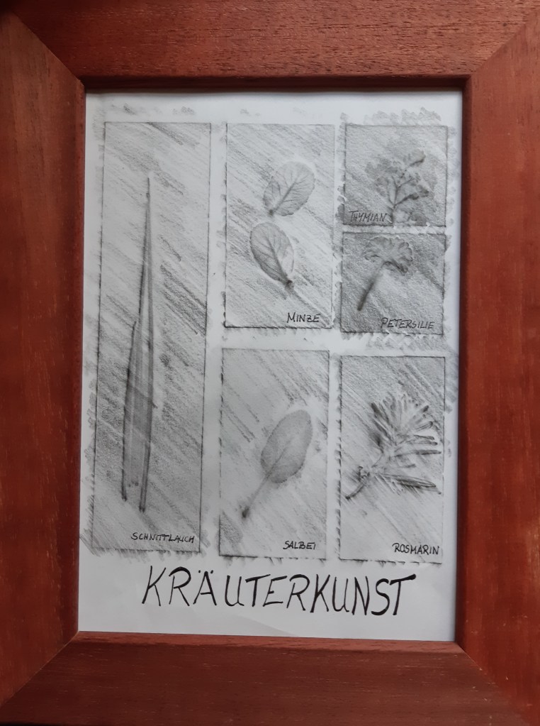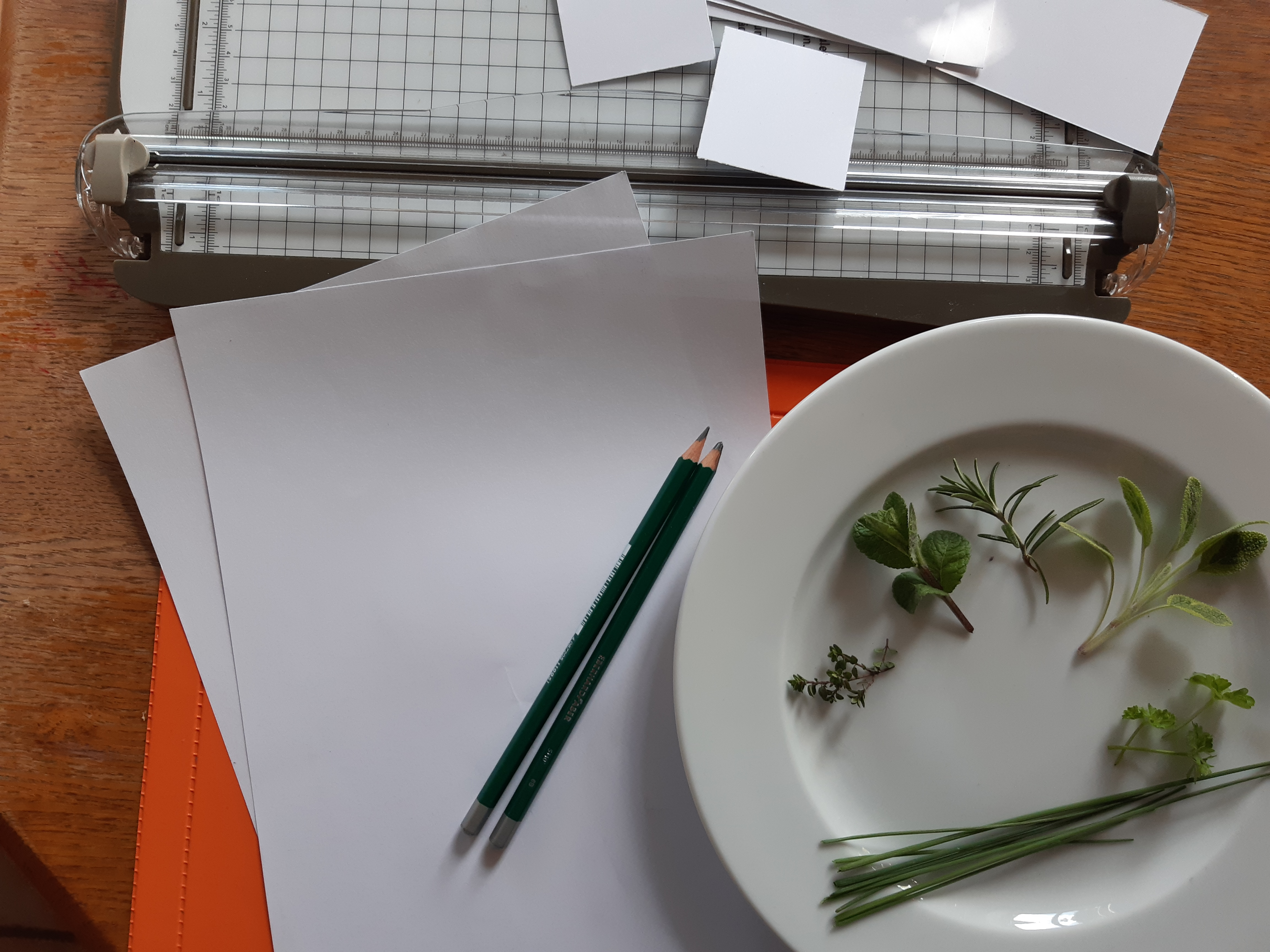 Materialliste „Kräuterkunst“: DinA4-Papier, ein Schneidbrett zum Zuschneiden von den einzelnen „Kräuter-Rahmen“, ein sehr weicher Bleistift (5B oder 6B)
