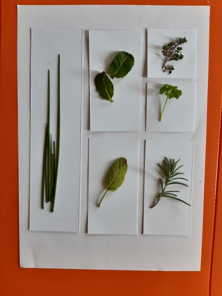 Sechs verschiedene Kräuter sollen in einer Collage auf Papier festgehalten werden. Das braucht Ihr dazu: