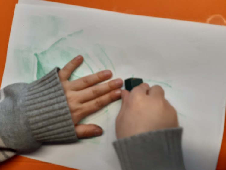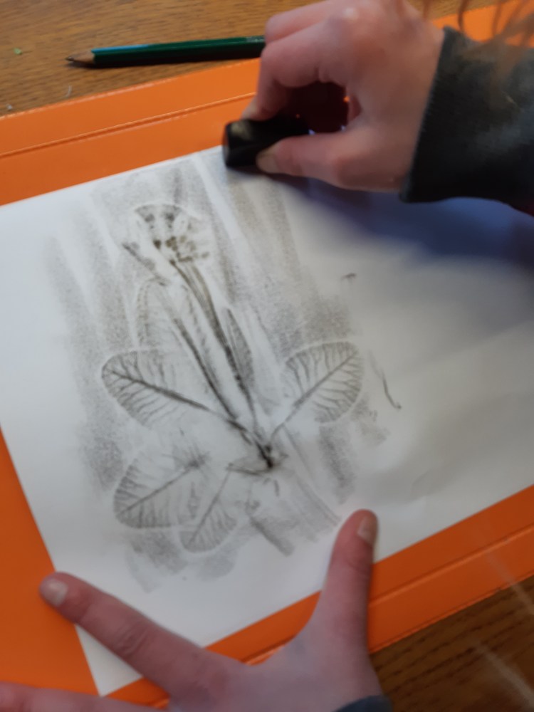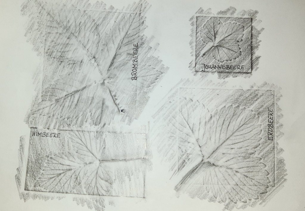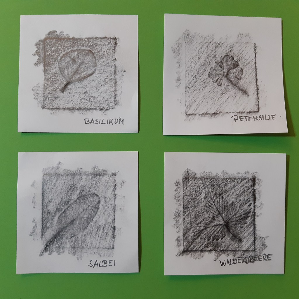 Ihr kennt die Technik alle: es geht darum, Strukturen durch Schraffieren auf ein Papier zu bekommen. Geldmünzen werden so „abgepaust“, manchmal auch Tortenspitzen. Und wir zaubern mit Bleistift oder Kreide das junge Grün aus dem Garten auf das Papier.