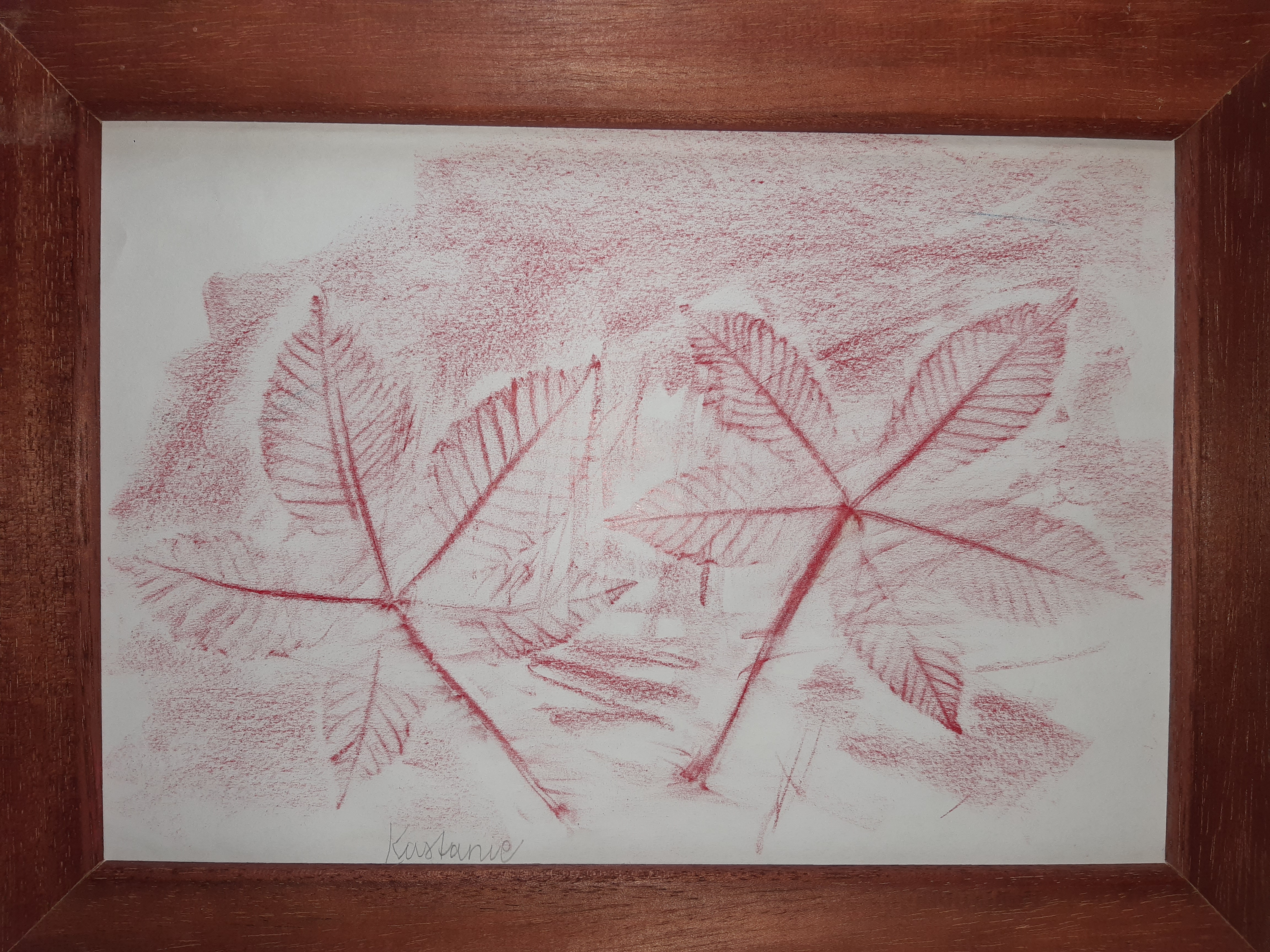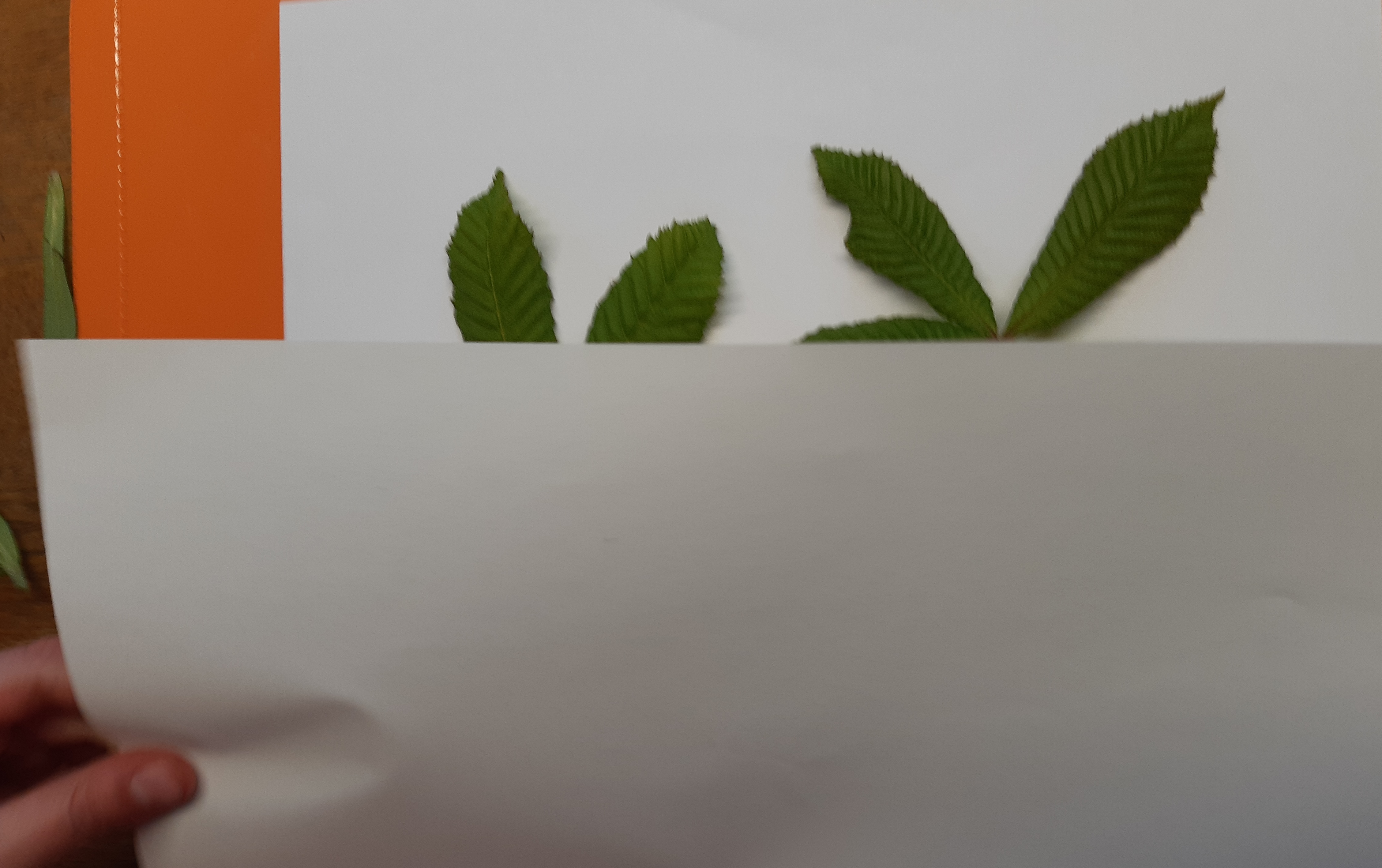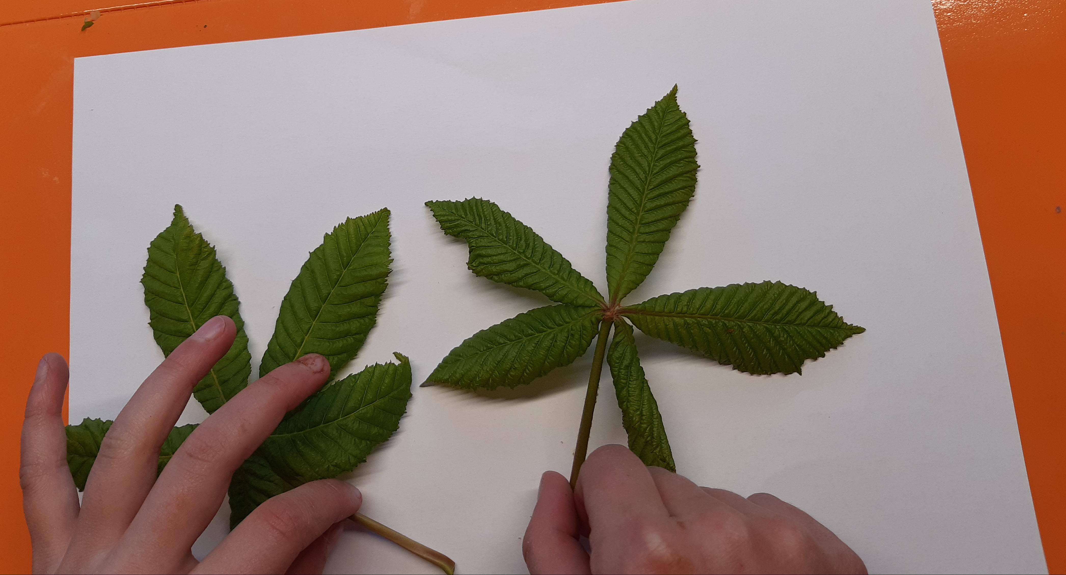 Zwei Kastanienblätter werden auf ein Blatt und eine Unterlage gelegt
