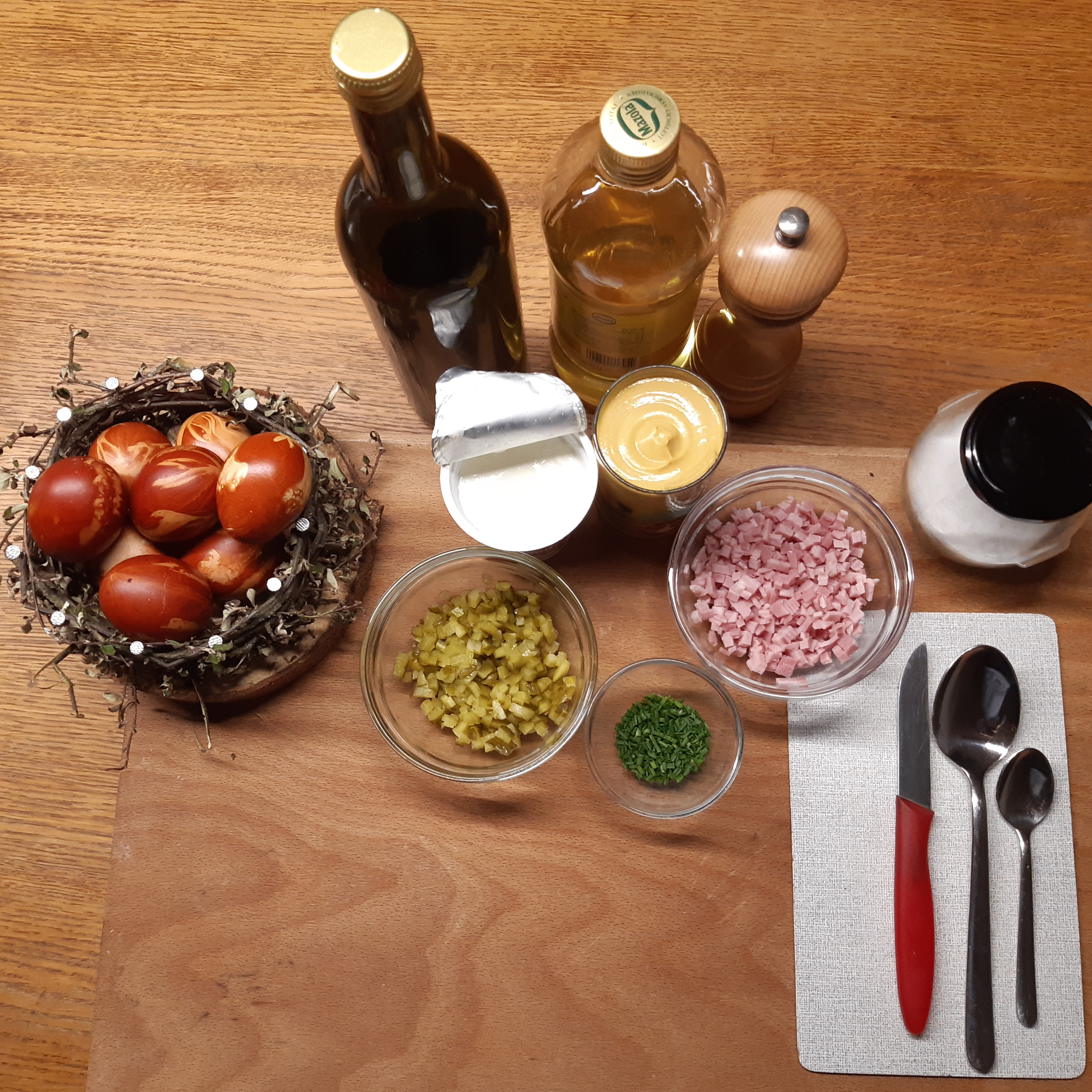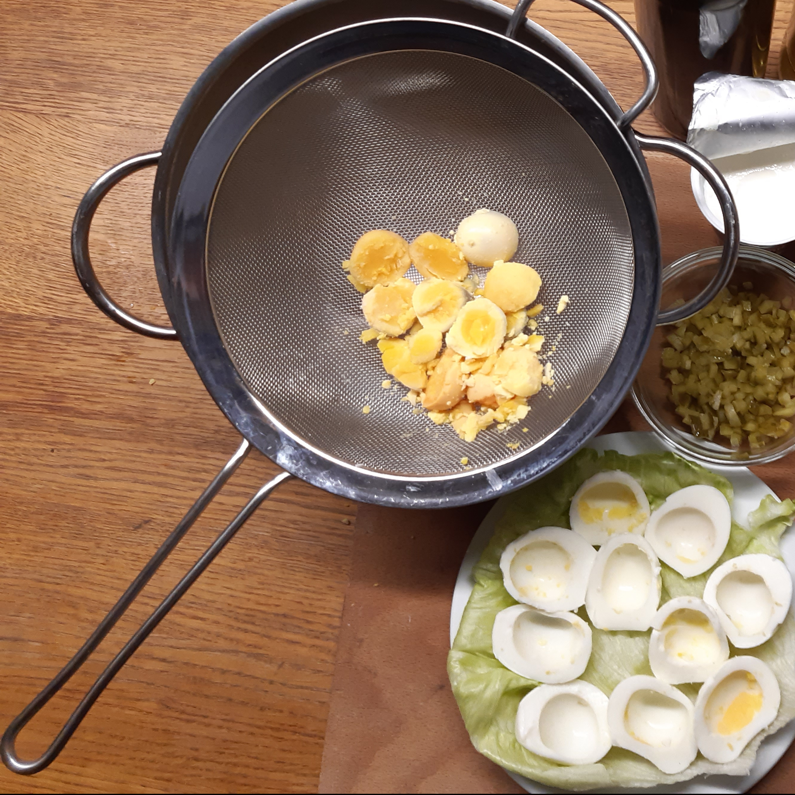 Schüssel, Sieb, Küchenmesser, Brettchen, EL und TL, Teller zum Anrichten der Eier, evtl. Spritztülle, um die Masse in die Eihälften zu spritzen.
