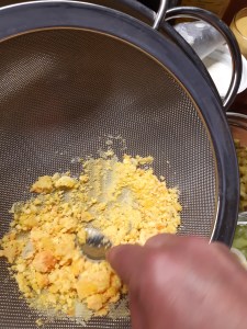 Als ich im Kochbuch und im Netz nach „Russischen Eiern“ suchte, war mir schnell klar, dass das nicht das ist, was es in meiner Kindheit gab. Mit Sardellen, Kapern und Kaviar wurde bei uns wenig hantiert. Ein Anruf bei Oma stellte einiges klar: Da handelt es sich um ein vornehmes Wort für praktische Resteverwertung… So ungefähr bekam ich dann auch ein Rezept übermittelt. Und das hab ich ausprobiert und für gut befunden.