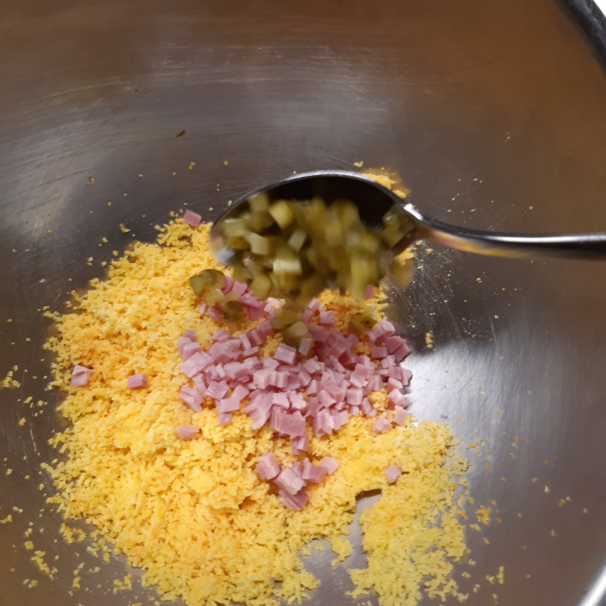 Nachdem ihr alle Zutaten zu dem Eigelb gegeben habt, und alles zu einer streichfähigen Masse verrührt habt, schmeckt ihr mit Salz und Pfeffer nach Eurem Geschmack ab. Dann kommt die Masse in eine Spritztülle und wird in die Eierhälften gespritzt. Da Schinken- und Gürkchenstückchen bei mir zu dick für den schönen, gewellten Spritzaufsatz waren, gab es nur einen „runden“ Aufsatz. Trotzdem gefällt es mir besser, als die Masse einfach mit einem Teelöffel in die Eier zu trapieren.