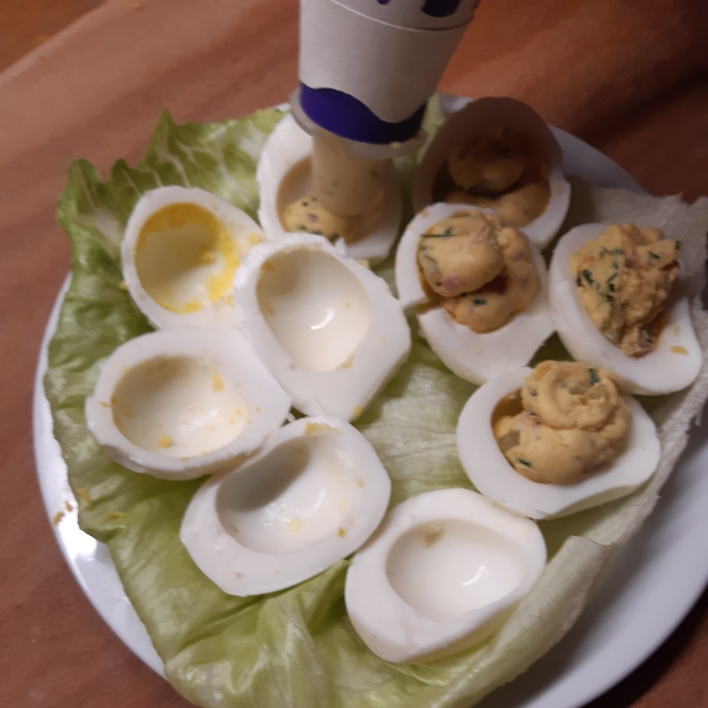 Eiermasse wird zurück in die Eierhälften gepritzt