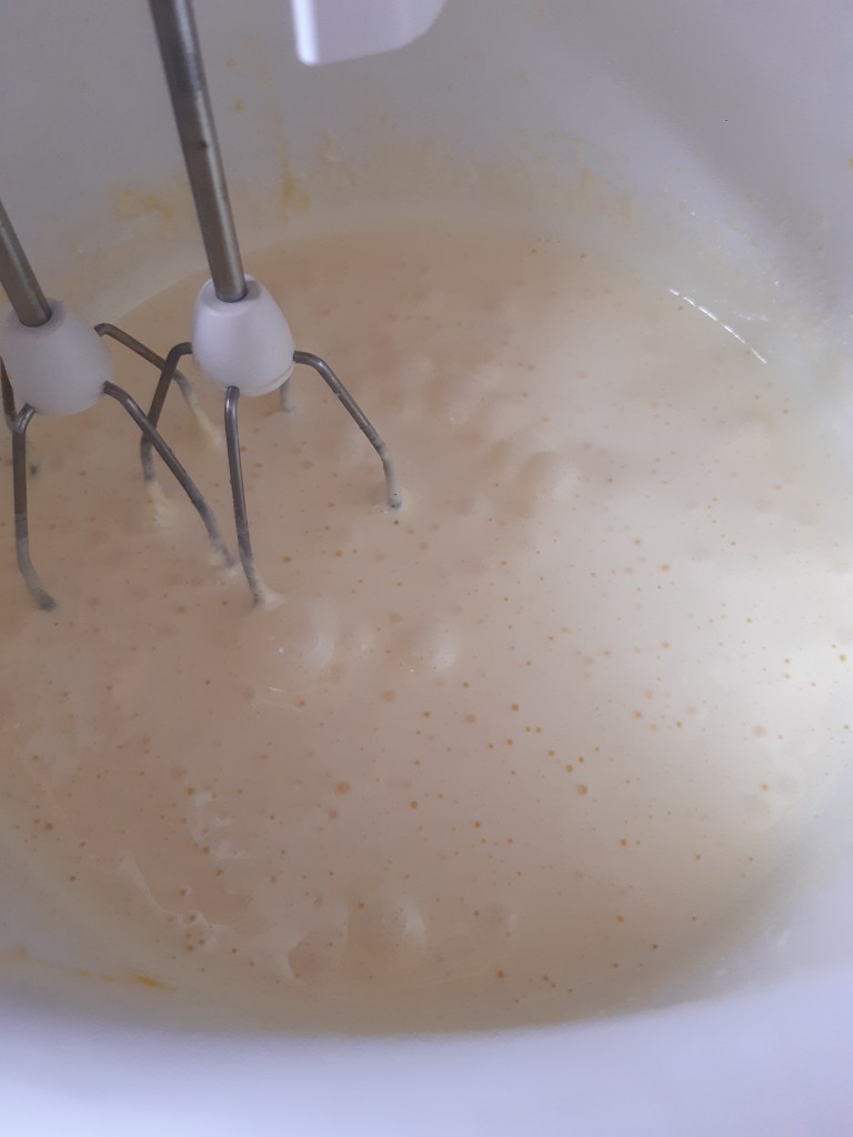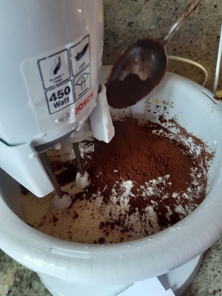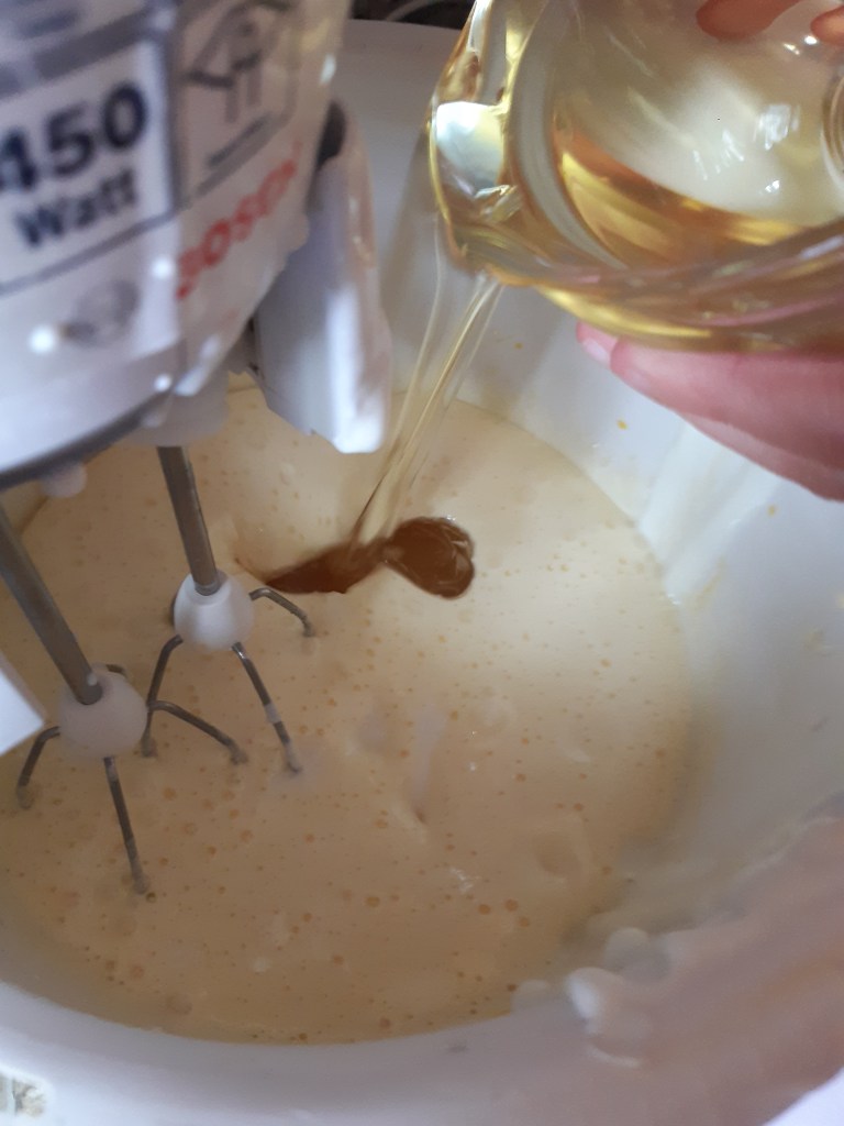 Eier, Zucker und Vanillezucker schaumig rühren…laaange, bis der Teig glänzt. Dann die flüssigen Zutaten schnell unterrühren, und auch die festen möglichst schnell und kurz in den Teig einarbeiten.