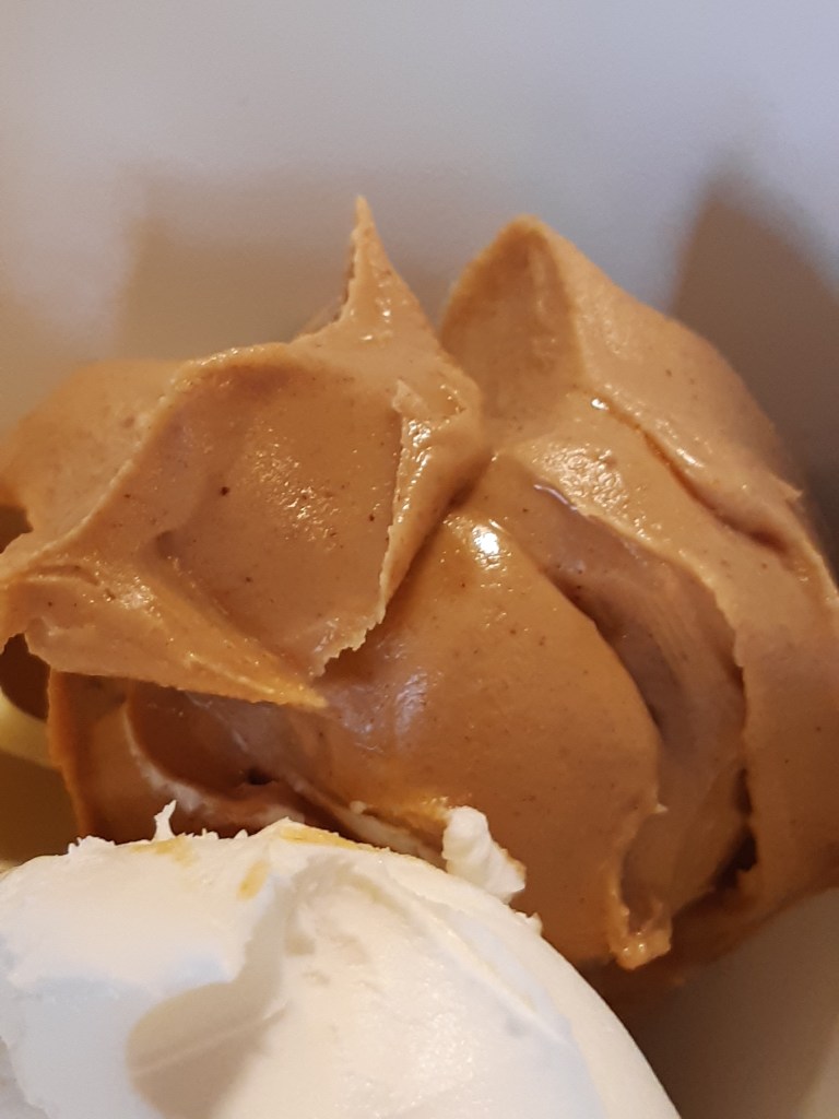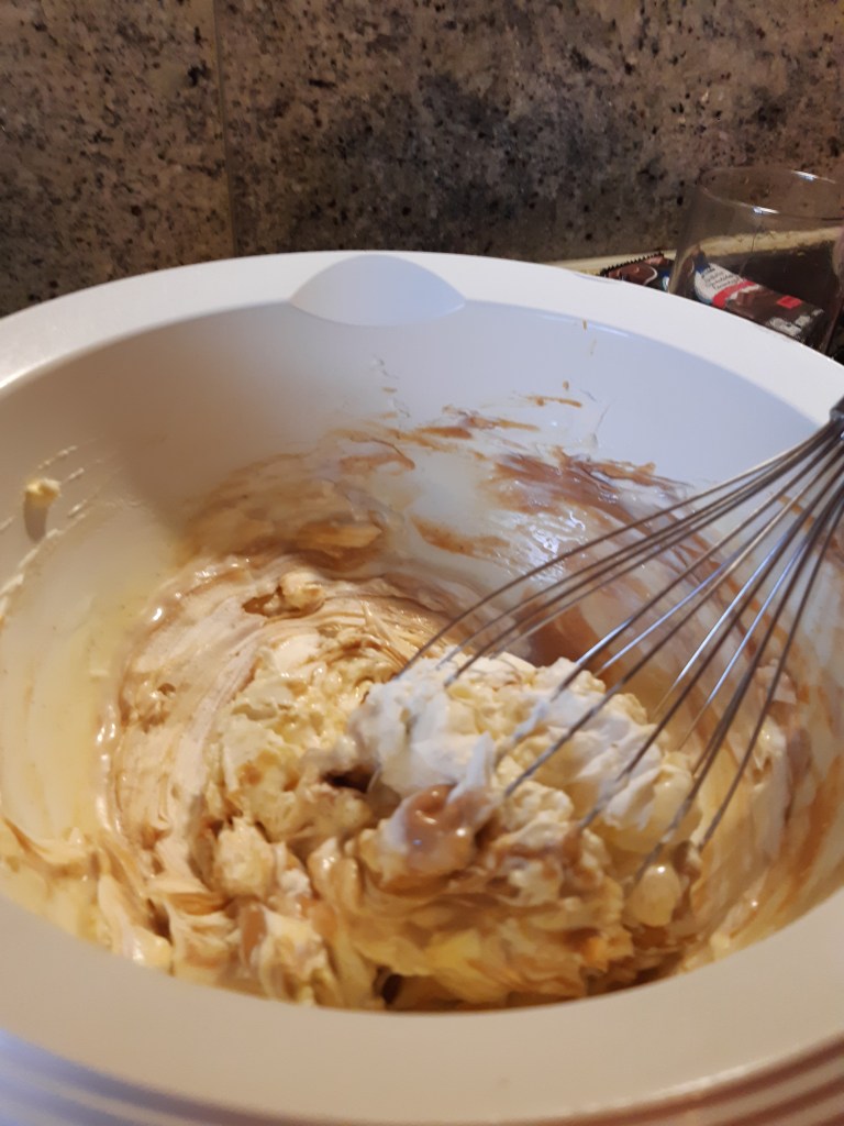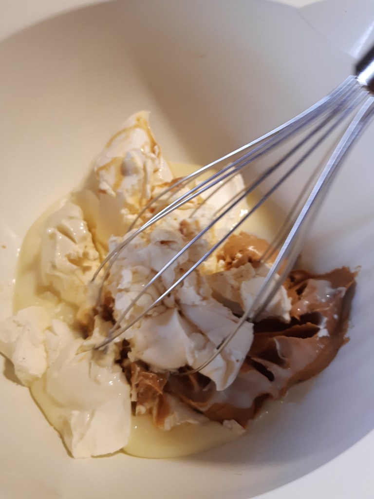 Mmmh… Die Creme ist echt der Hit. In einer Schüssel werden 400 ml Sahne mit Sahnesteif geschlagen. In einer zweiten Schüssel werden Marscarpone, Erdnussbutter, süße Kondensmilch und Vanillepaste verrührt. Anschließend wird die Sahne untergehoben: