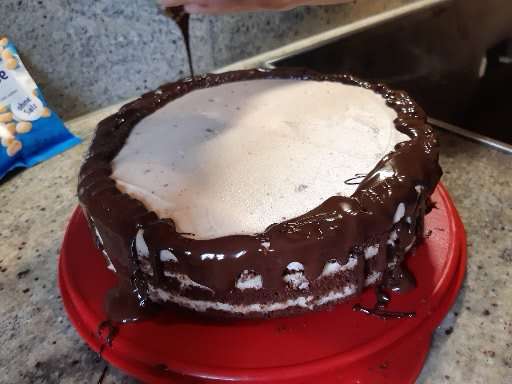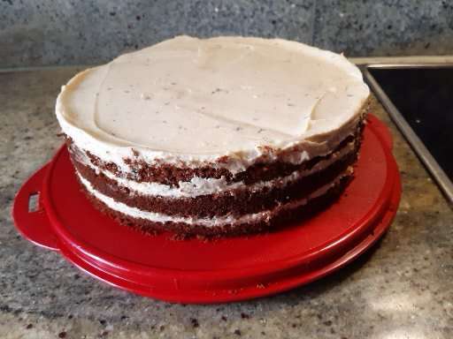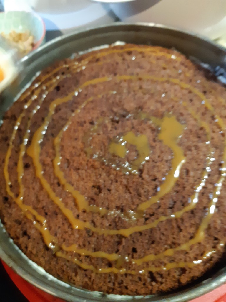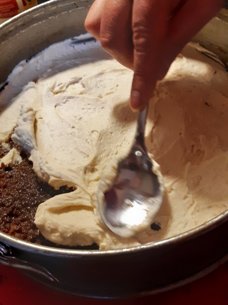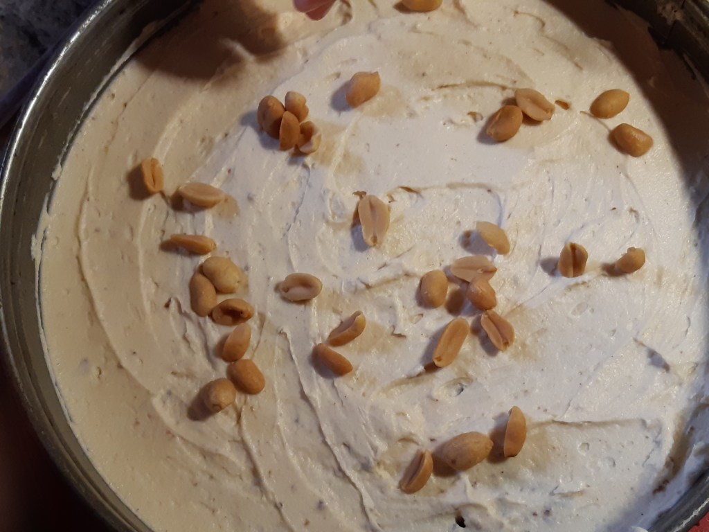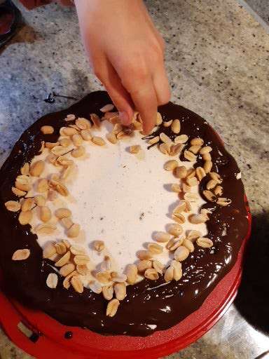 Jetzt wird der Tortenboden zweimal durchgeschnitten. Der Tortenring wird wieder um den untersten Boden geschnallt. Jeder Boden wird mit Karamell-creme getränkt (wir haben eine bei den Eis-Toppings im Supermarkt gefunden). Dann kommt jeweils ein Drittel der Creme darauf, und es werden ungesalzene Erdnüsse auf darauf verteilt. Hier ein paar Bilder: