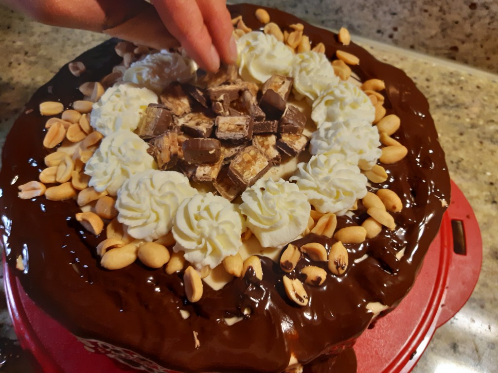 Als erstes schmelzen wir die Konfitüre und lassen sie über den Rand der Torte „tropfen“. Gleich darauf werden die Erdnüsse in die noch warme Konfitüre gelegt, und dann ein Ring Sahnetupfen gespritzt. In der Mitte gibt es das Beste: klein geschnittene Snickers-Stückchen. Ein Gesamtkunstwerk. Finden wir 🙂