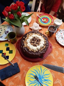 Und ab geht es zum Sonntags-Frühstück! Wir freuen uns alle auf die Torte… Mehr als ein Stück, schafft allerdings keiner. Ideal wäre eine so reichhaltige Torte für eine große Geburtstagsparty, bei der jeder ein kleines „Probiererl“ nimmt, und damit glücklich ist. Aber in diesen Zeiten… wandert die Hälfte der Torte erst einmal in die Gefriertruhe. Aber schon am Nachmittag wird sie an Nachbarn verteilt, weil alleine unsere Erzählungen so begeisterten, dass die Spaziergänger sich gerne ein Stück mit nach Hause nahmen.