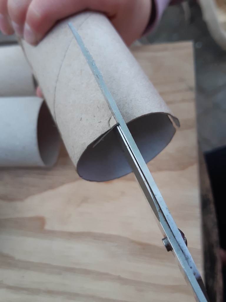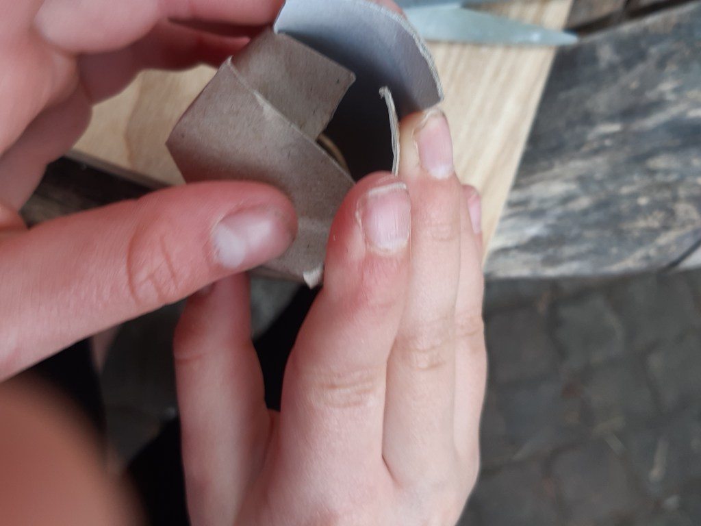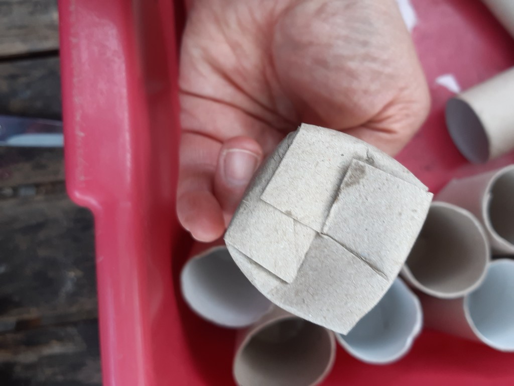 Die Klopapierrollen werden an einer Seite in allen vier Himmelsrichtungen ca. 2 cm tief eingeschnitten. Anschließend faltet man die vier Flügel zu einem Verschluss, wie bei einem Paket (immer eine Ecke über die andere…). Das ist der Boden unseres Aussaattöpfchens.