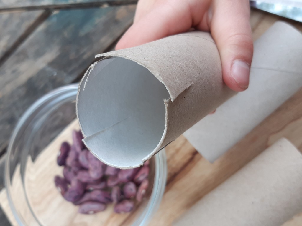 Mein erster Schritt zum Bohnen-Tipi ist das Vorziehen der Bohnen in selbst gebastelten Aussaat-Töpfchen. Das Vorziehen ist mir deshalb wichtig, weil ich bei der direkten Aussaat von Bohnen in den Garten schon einiges an schlechten Erfahrungen gesammelt habe. Oft genug blieben die Pflänzchen aus. Zu kalt, zu trocken, zu lecker für Vögel oder Erdbewohner… es gibt viele Gründe, warum es nicht klappt. Deshalb möchte ich auf Nummer sicher gehen, und säe die Bohnen in kleine Aussaattöpfe. Und weil Klopapier in diesem Jahr in allen Haushalten erstaunlich häufig anzutreffen ist, verwende ich die Rollen als einfache Aussaattöpfchen. Trotz Großfamilie muss ich in der Nachbarschaft sammeln gehen. Dankeschön dafür!