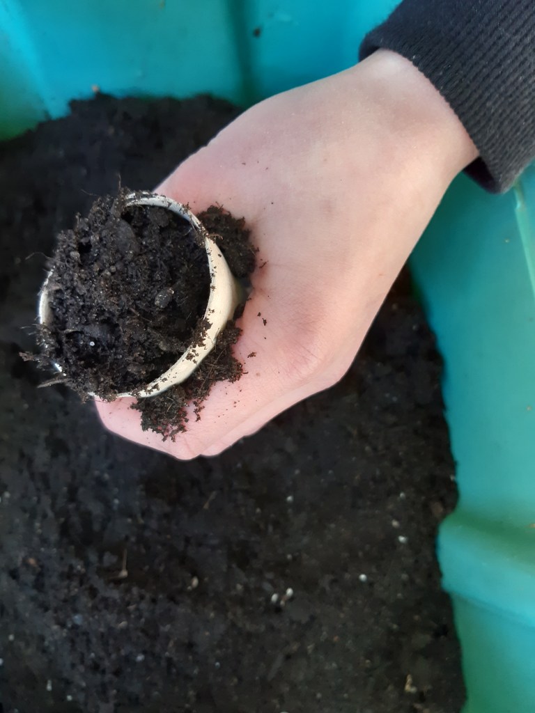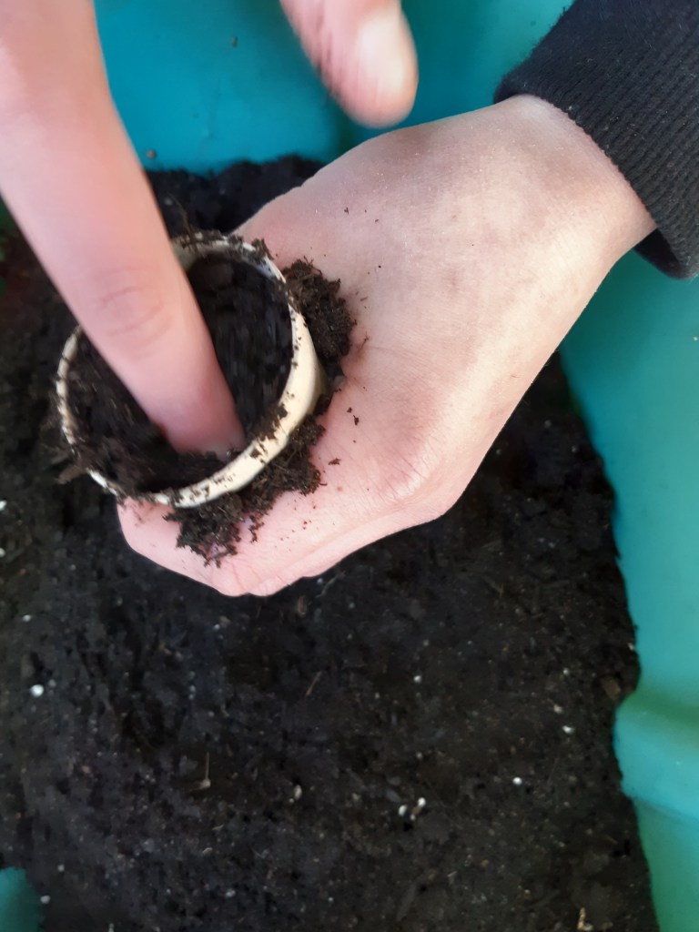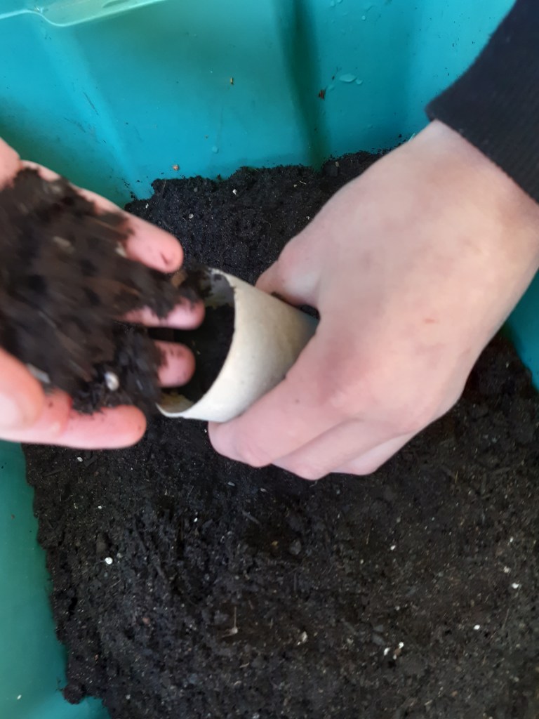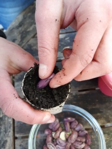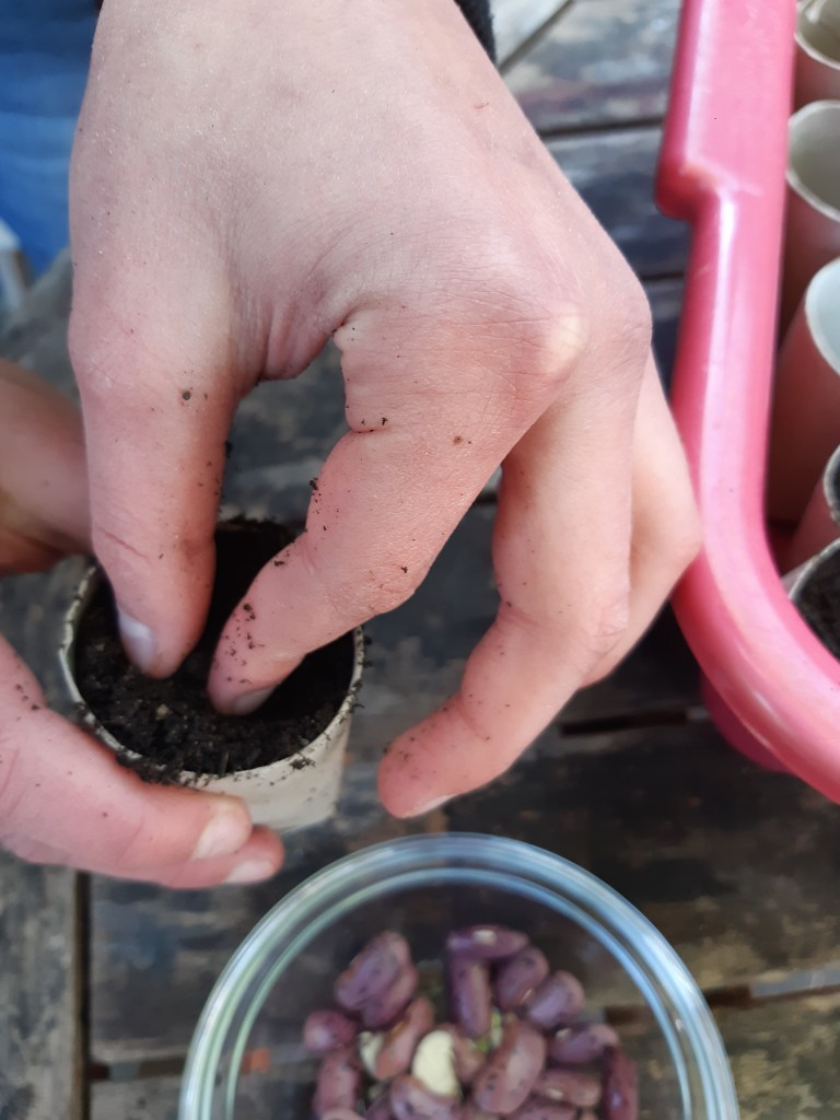 Das Befüllen der Aussaattöpfchen mit Erde und das Aussäen der Bohnensamen
