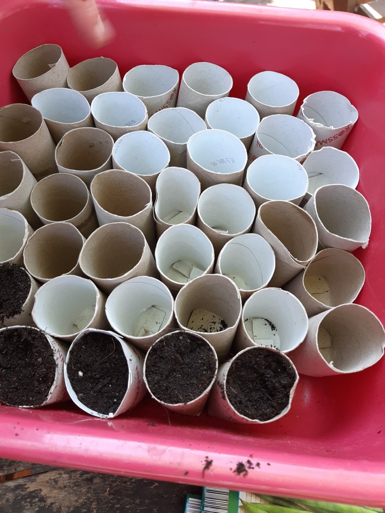Nekarköniginund auch ein paar Käferbohnen (weil die so tolle Blüten haben) ausgesucht) - Klopapierrollen, pro Samen eine Rolle