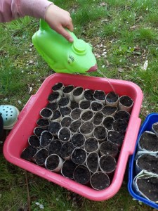 Das Procedere ist einfach, musste aber 75 Mal wiederholt werden (so viele Bohnenpflanzen sind unser Plan… die Kids haben noch nicht gerafft, dass sie das auch alles essen sollen…). Es vergeht eine Weile, bis die Kiste angegossen werden kann.