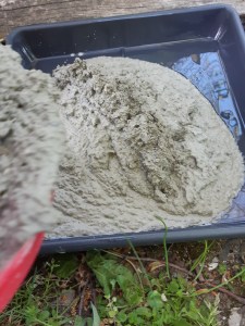 - Darauf achten, dass die Masse nicht zu flüssig wird. Ansonsten schwimmt nach kurzer Zeit eine Wasserschicht in der Form oben auf, was das Belegen mit Steinen etc. erschwert und diese teilweise nach dem Trocknen nicht richtig mit dem Beton verbindet. Die Deko könnte also schnell wieder abfallen.