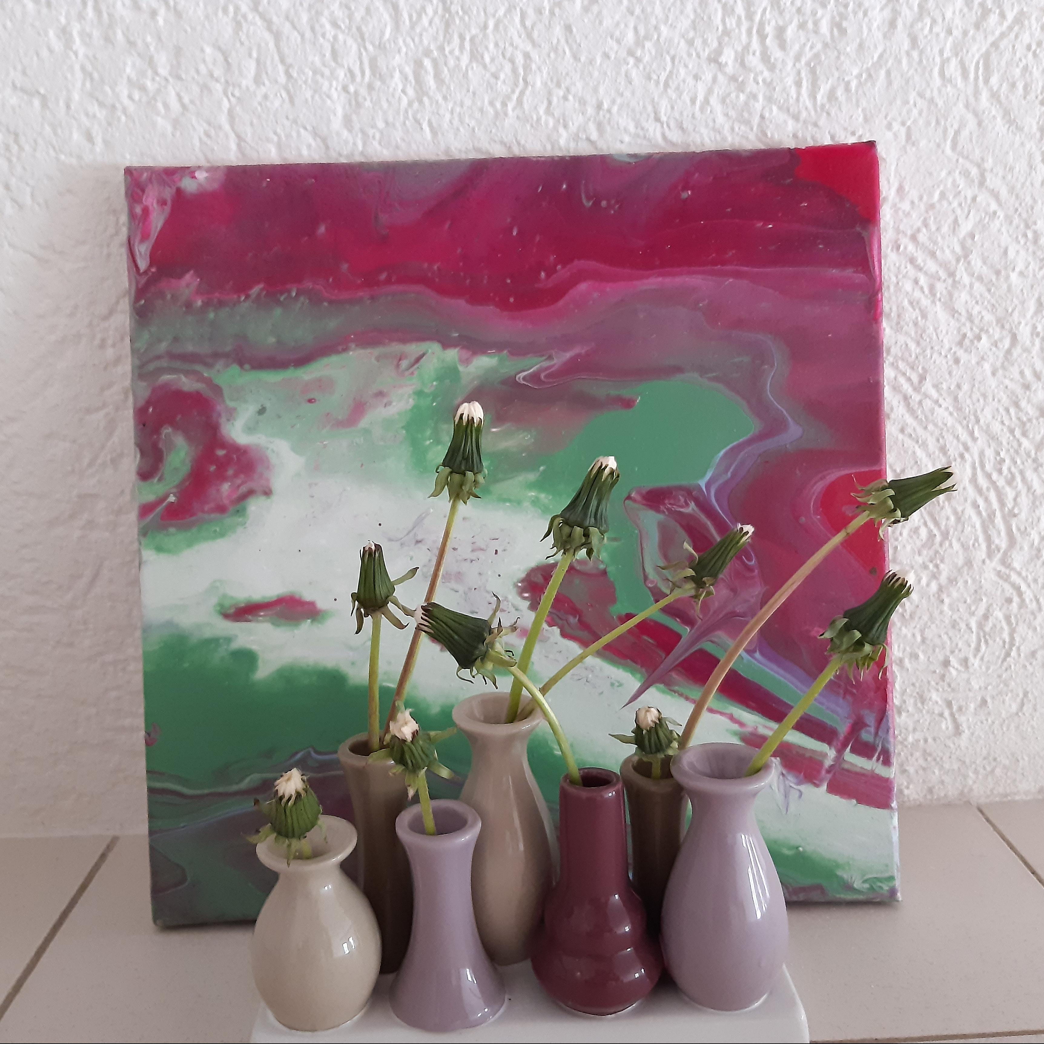 - Um die durchsichtigen Bälle besser zur Geltung zu bringen, haben wir eines unserer Pouring-Kunstwerke dahinter gestellt