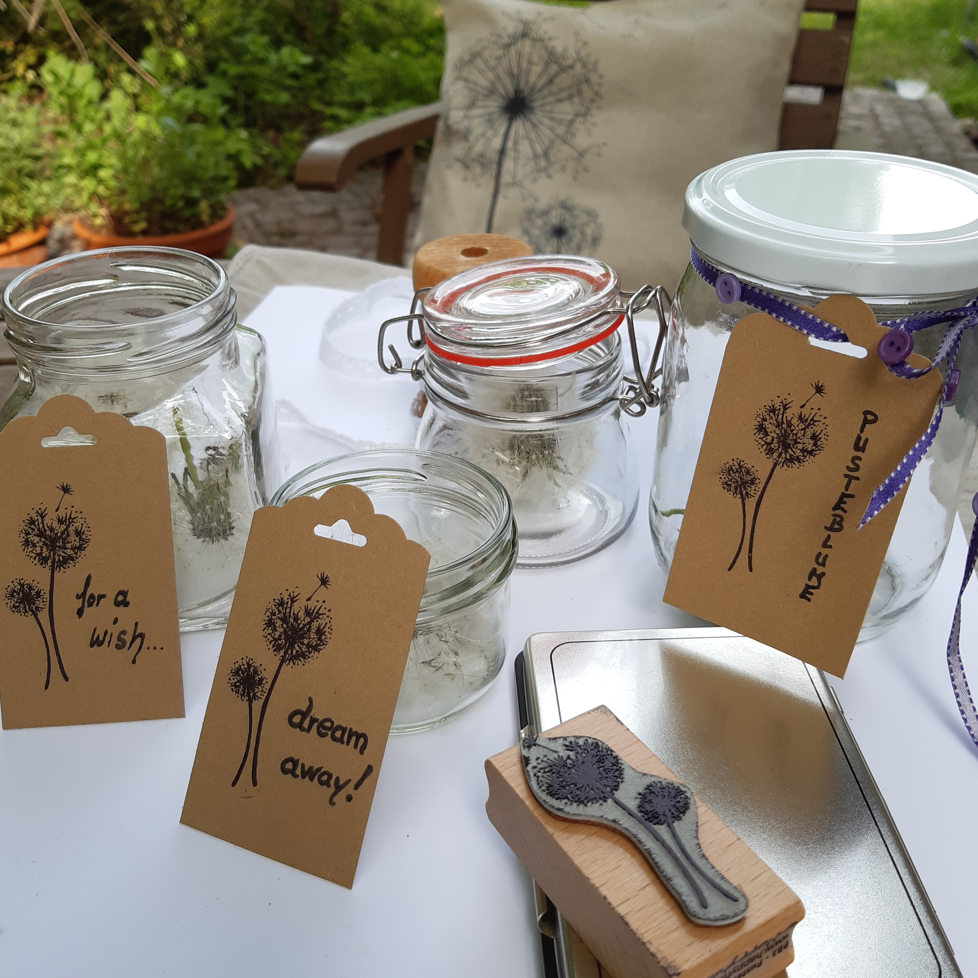 Unsere Glücksmoment im Glas sind gepflückte Pusteblumen, die wir in kleine Marmeladengläschen gelegt haben und mit einem bestempelten Anhänger verziert haben. Sie halten ca. 3-4 Tage bei vorsichtigem Transport. Sehen aber schick aus und eignen sich auch als Tischdeko…. als Mitgebsel für Erwachsene…. als kleine Bastelaktion beim Kindergeburtstag….