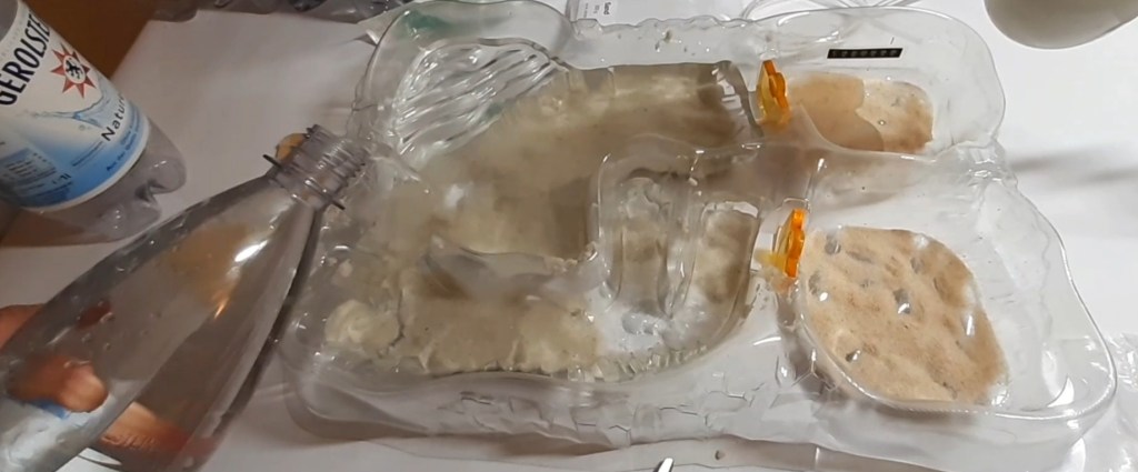 Damit die Triops aber auch in dem Becken schwimmen können, müsst ihr Mineralwasser hineinfüllen.