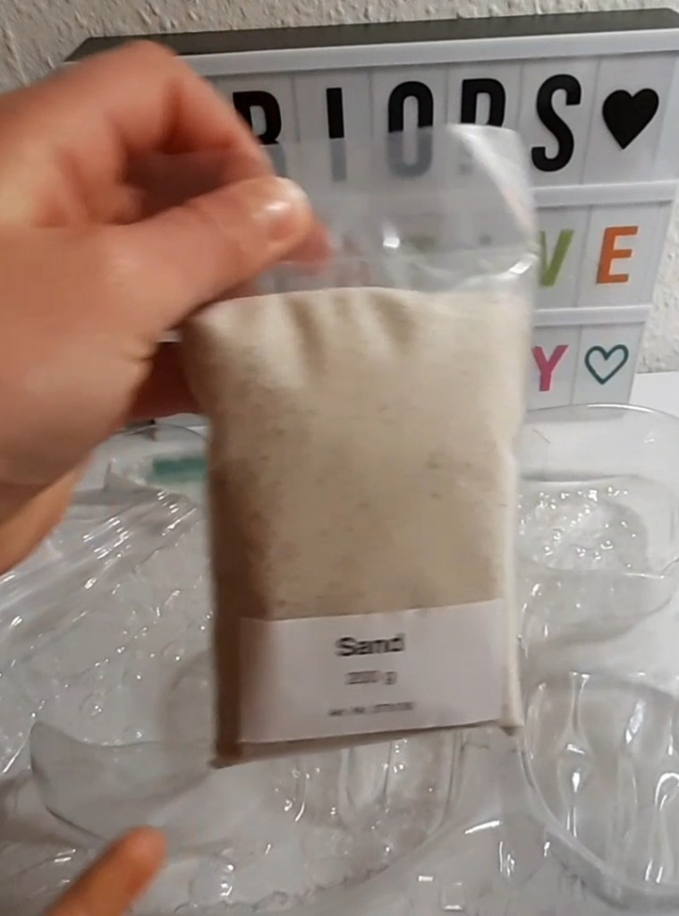Nehmt die Schüssel und gebt die Hälfte des normalen Sandes herein.