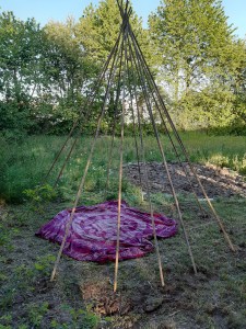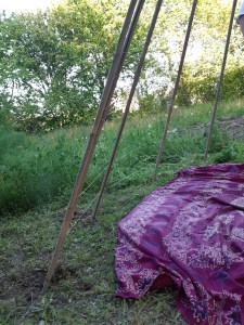 Zum Aufbau sind zwei Erwachsene von Vorteil. Bisher ist das Tipi nur leicht im Boden verankert, die Stangen sind mit einer Schnur im Abstand von ca. 30cm verbunden:
