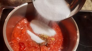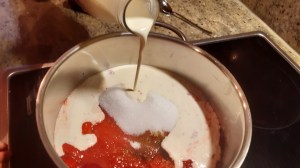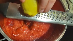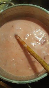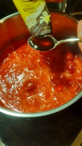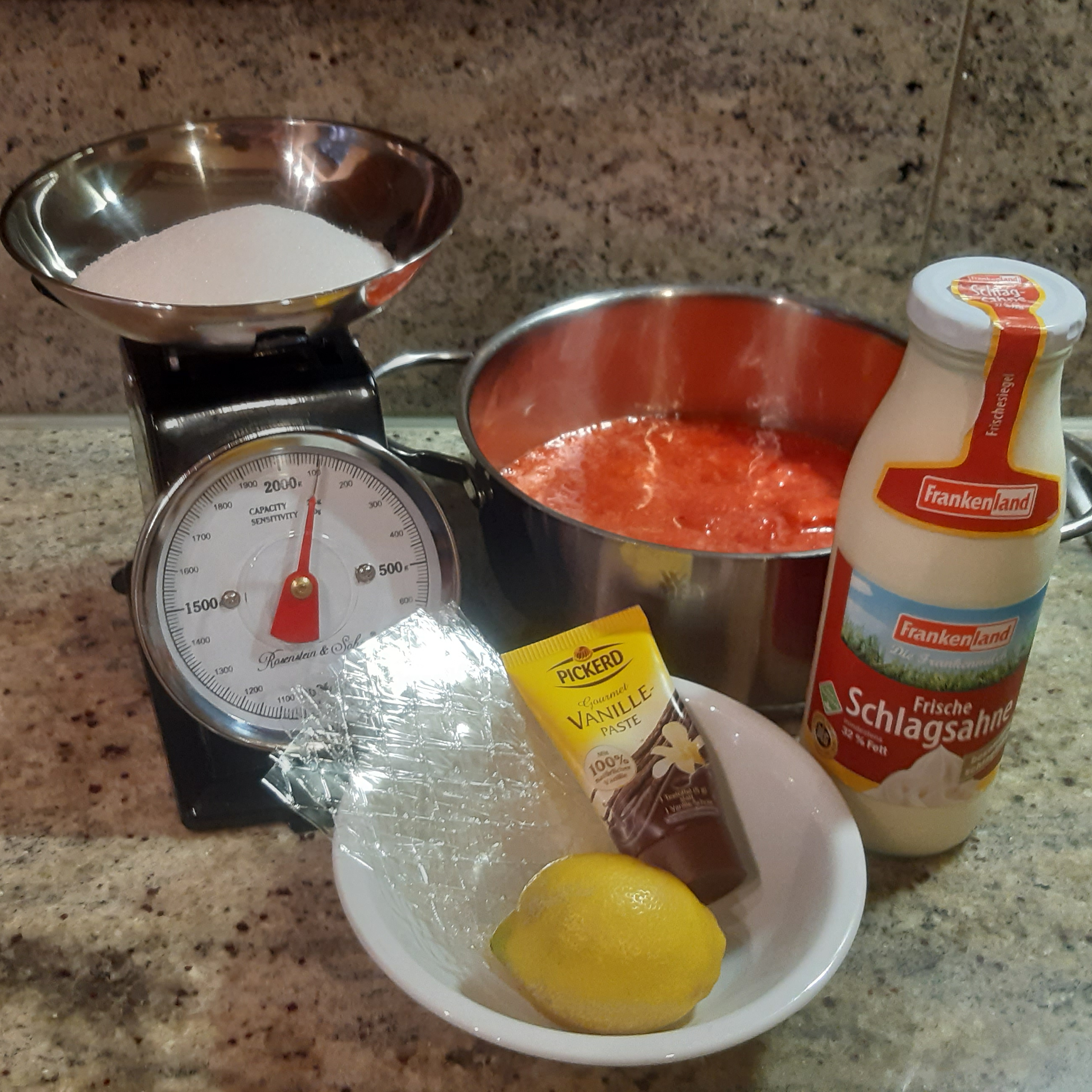 Die Erdbeeren werden mit Vanilleextrakt, der Schale einer Zitrone, dem Zucker und dem halben Liter Sahne zum Kochen gebracht und sollen ca 15 Minuten leise köcheln.