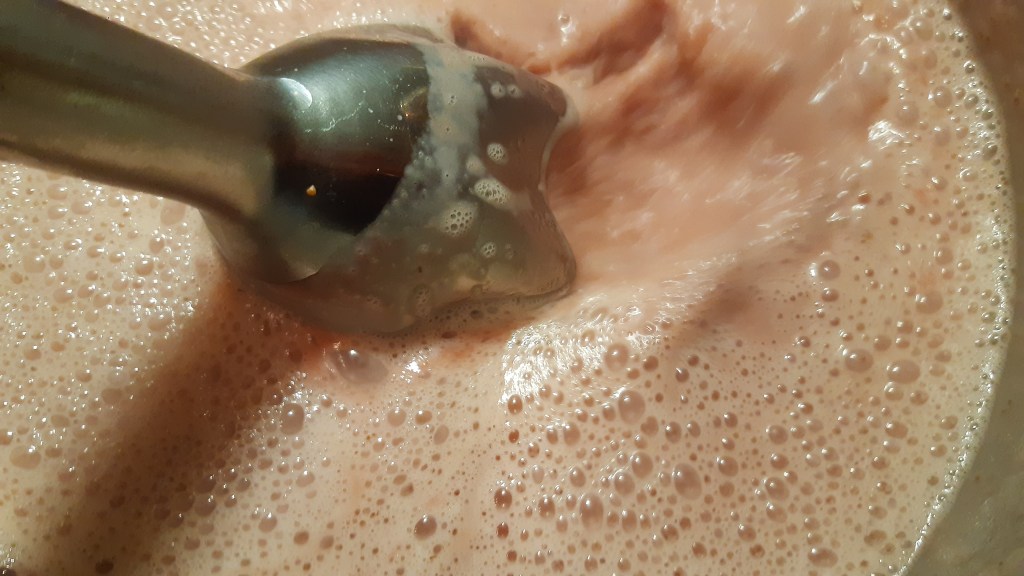 Währenddessen wird die Gelatine 5 Minuten in kaltem Wasser eingeweicht. Nach der Kochzeit wird die Masse noch einmal kräftig püriert und vom Herd genommen.