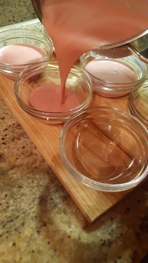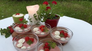 Erdbeer-Pannacotta noch warm in Schälchen füllen und mehrere Stunden auskühlen lassen.
