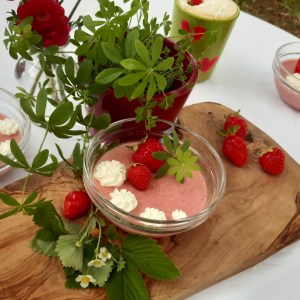Das Auge isst mit! Deshalb dekorieren wir unsere Erdbeer-Pannacotta mit Sahnetupfern, ein paar frischen Erdbeeren und Waldmeisterblättern: