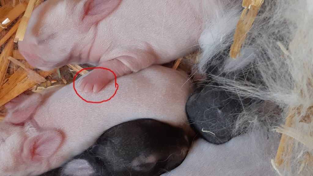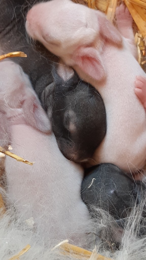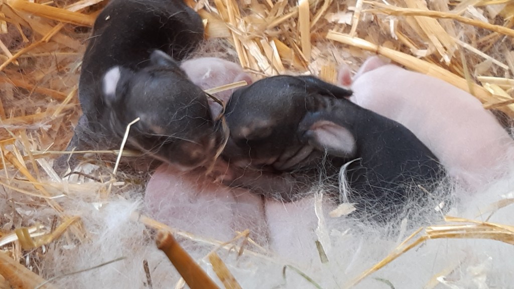 Zwei der Fünf Kaninchenbabys werden wahrscheinlich eine ähnliche Fellfarbe wie ihr Vater Pepper erhalten.