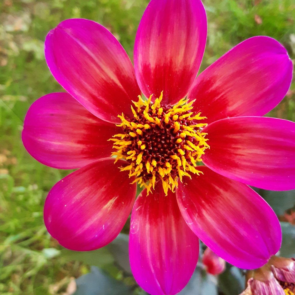 Bei „Rockin´ Rosi“ handelt es sich um eine einfach blühende Dahlie mit dunklem Laub und einer Blüte, die sehr viele Farben in sich vereint. Somit ist die Rosi ein wahres Kombinations-Wunder. Mit ihr geht alles von Pink über Lila bis hin zu Rot, gelb und Weiß. Weil sie eine einfache Blüte hat, kommen auch Insekten aller Art damit zurecht, hier Nektar zu holen. Natürlich blüht sie immer wieder bis weit in den Herbst hinein.