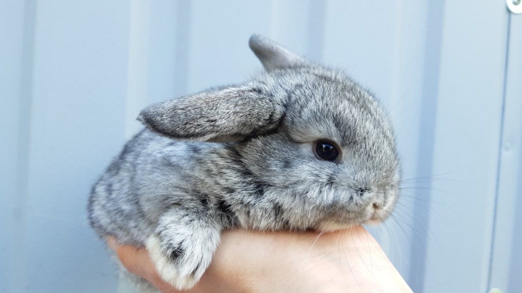 Zwei Kaninchen sehen ihrem Vater Pepper sehr ähnlich, da sie den gleichen Grauton im Fell haben wie er.