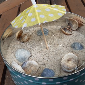 Momentan steht die Dose, halb gefüllt mit echtem Nordseesand, in dem sich einige Muscheln und Steine tummeln, auf der Terrasse.