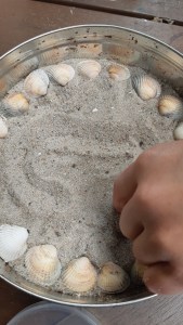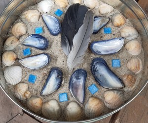 Wann immer wir am Meer sind, nehmen wir etwas Sand und natürlich die schönsten gesammelten Muscheln und Steine mit.