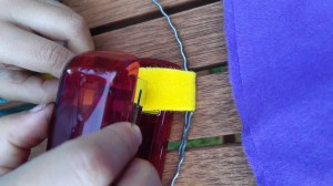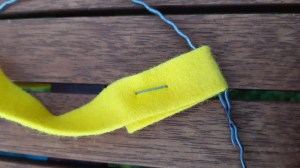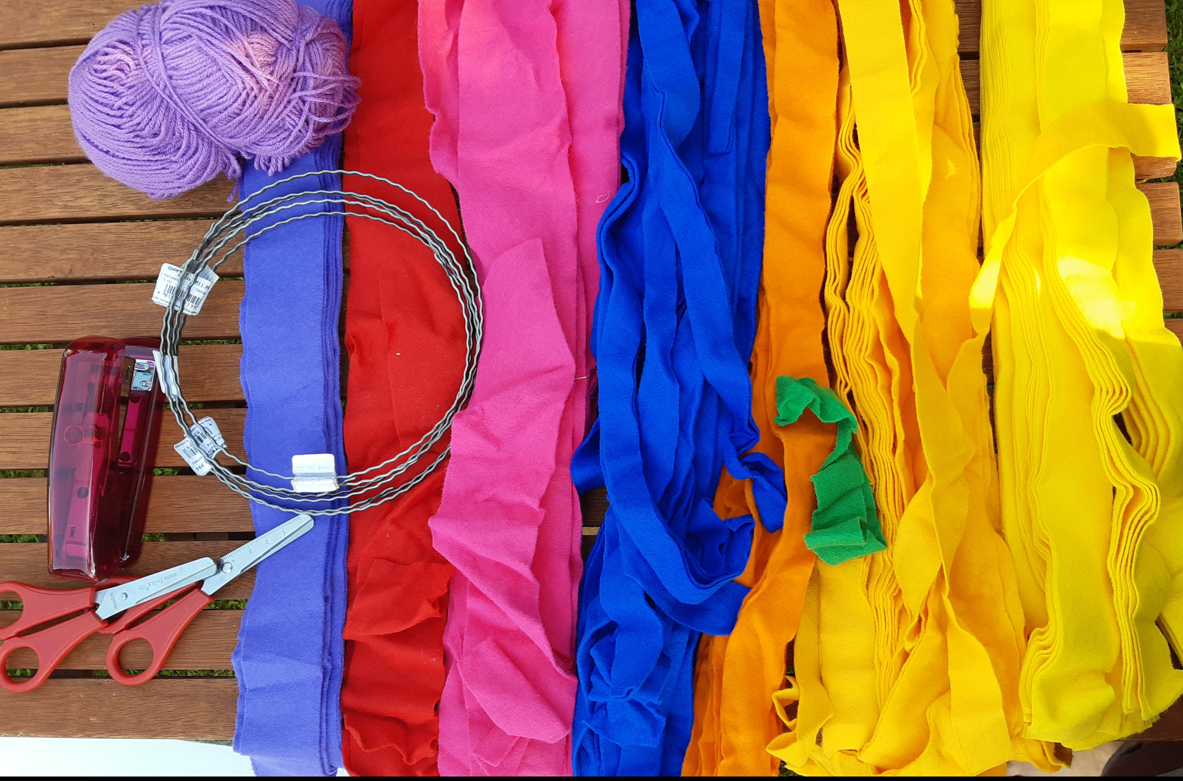 Filz oder Stoff in dünne, lange Streifen schneiden, sich eine farbliche Kombination überlegen und die Streifen vorbereiten (evtl die Länge angleichen oder die Enden spitz zuschneiden)