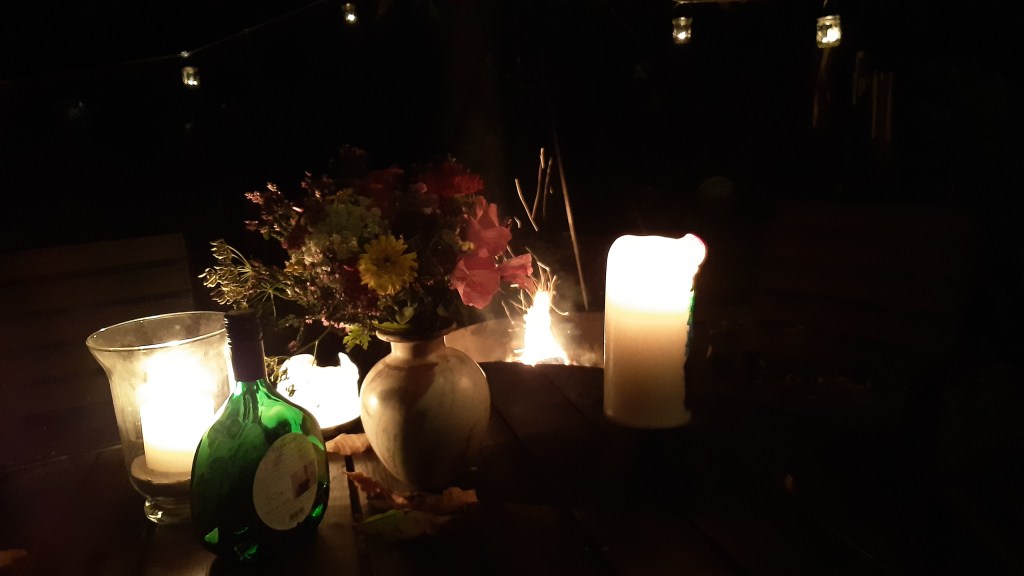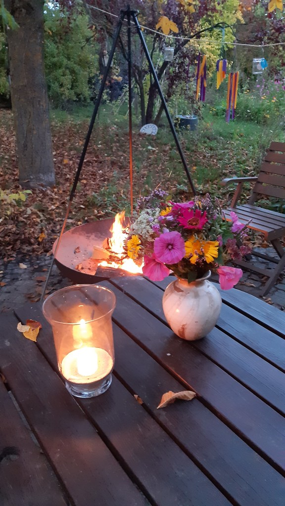 Um 19:00 Uhr ist es schon richtig dunkel, aber mild. Und der Herbstblumenstrauß erfreut auch bei Kerzenschein am Feuer.