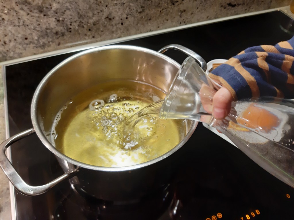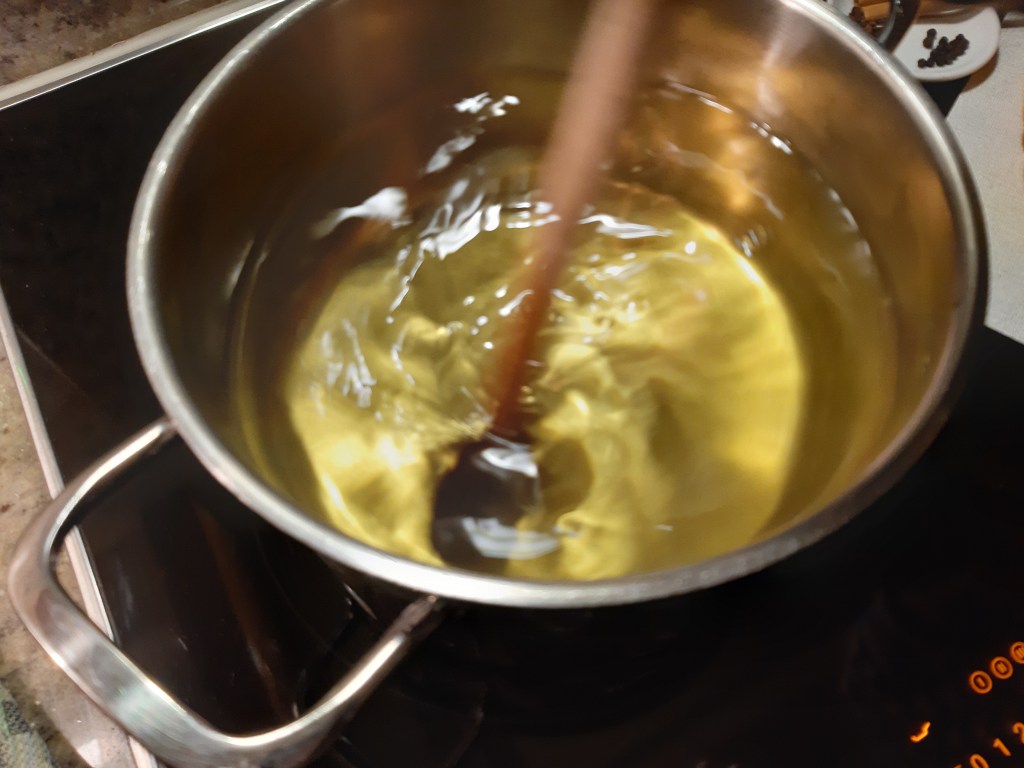 Diese 3 Zutaten erhitzen, ohne sie zum Kochen zu bringen, und warten bzw rühren, bis sich der Zucker aufgelöst hat.