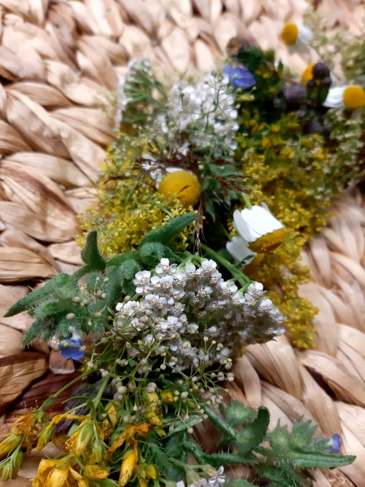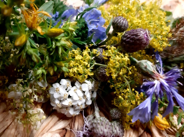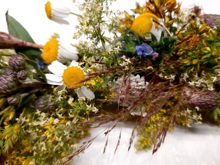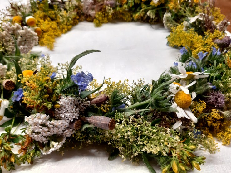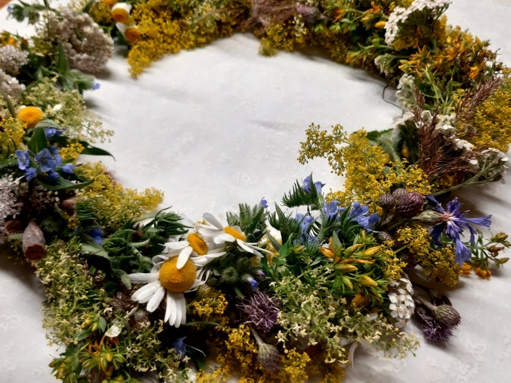 Eine Freundin postete wunderschöne Mittsommerkränze, die ihre Kinder heute gemacht hatten. Da juckte es mich sofort in den Fingern… wie lange ist es her, dass ich einen Kranz gebunden habe? War der letzte womöglich der Adventskranz? Nein, es war ein Türkranz aus Birkenzweigen dazwischen, aber nichts Blumiges! Schon ewig nicht mehr! Letzten Sommer dafür umso mehr. Erinnert Ihr Euch? Schaut mal: Ein Kräuterkranz zu Mariä Himmelfahrt. Und einer meiner Kränze von damals hängt noch hinterm Haus: