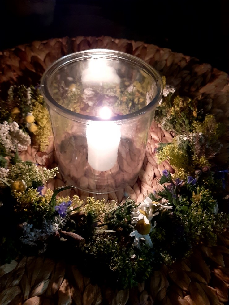 Zu schade, dass die Sonne beim Blumensammeln schon unterging. So ist der schöne Anblick nur von kurzer Dauer… Morgen früh ist der mein gebundenes Sommerglück bestimmt schon verwelkt… aber wir haben den Kranz noch bei Kerzenschen bewundert!